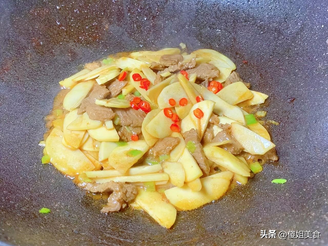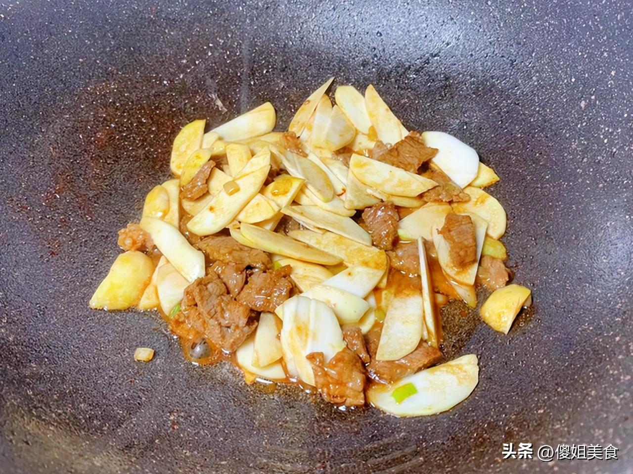 5、沿着鍋邊淋入少量清水,蓋上鍋蓋,轉中小火燜煮3-5分鐘,這一步是爲了讓芋頭徹底熟透,並充分吸收牛肉和蔥花的複合香味,打開鍋蓋後,湯汁會變得略微濃稠。最後轉大火,快速翻炒將湯汁收濃,根據口味調入適量的鹽,翻炒均勻即可出鍋裝盤。