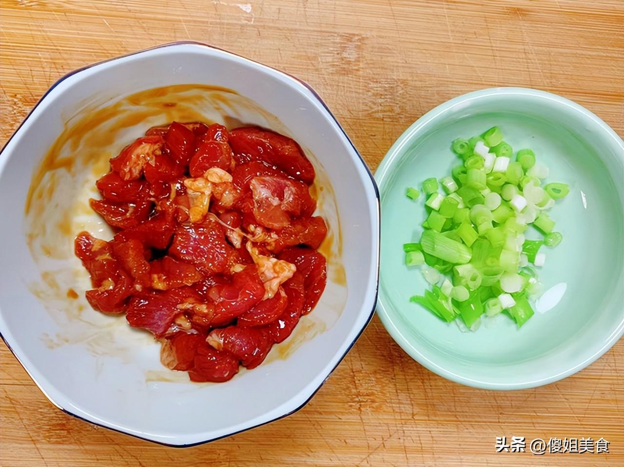 【芋頭炒牛肉】準備食材:芋頭、牛肉、小蔥、生粉、味極鮮、雞蛋(只要蛋清)、鹽、小米辣、食用油