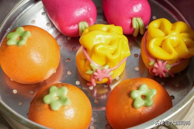 雙色麪糰:將菠菜汁/胡蘿蔔汁替代部分溫水,製作彩色包子。