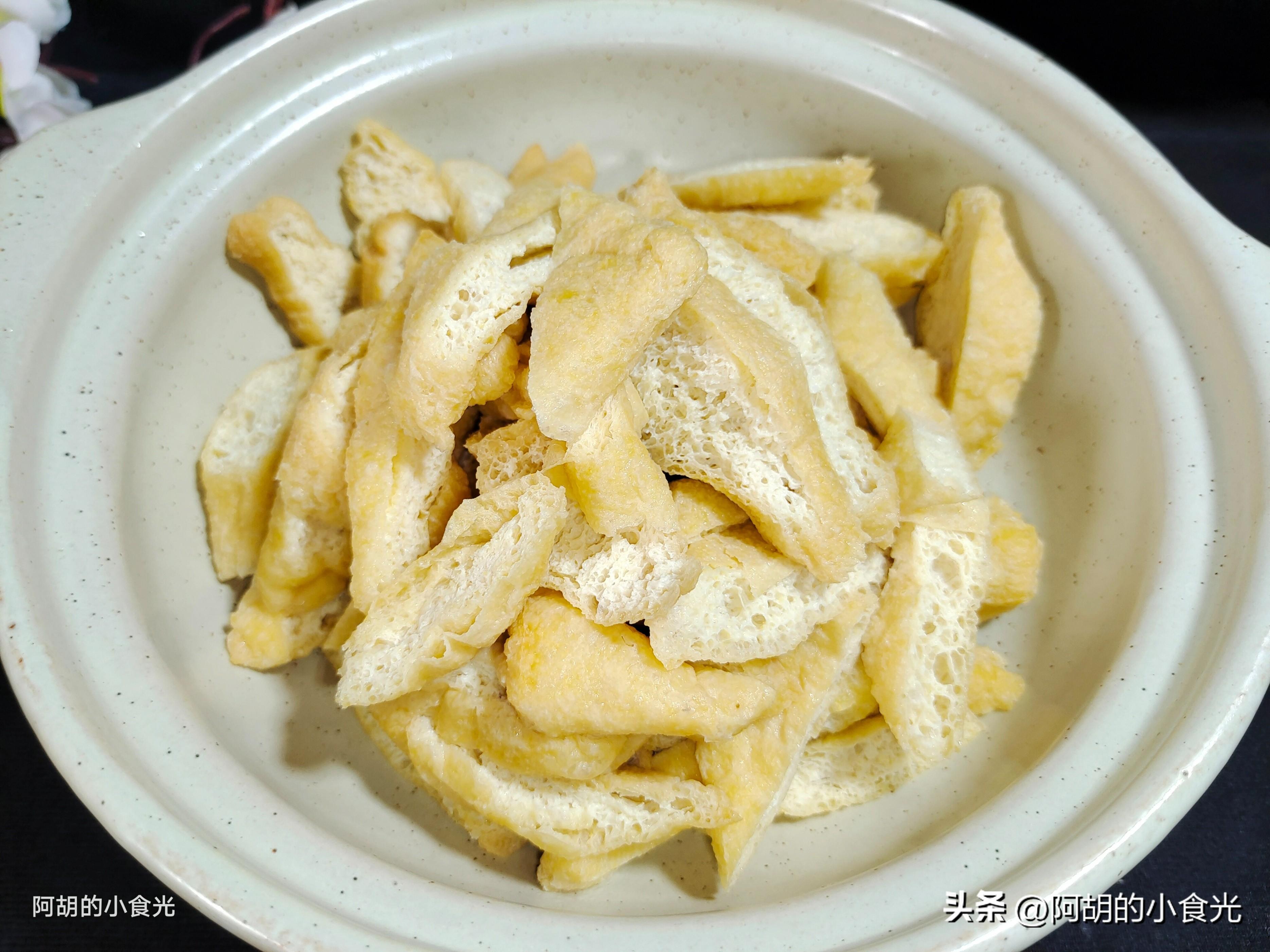 第一步:準備一些油豆腐,很多朋友怕油豆腐太油膩了,這裏建議可以將油豆腐下入開水鍋中焯燙一分鐘左右,過程中用勺子按壓入水中,撈出後再快速用涼水衝一衝,直至完全冷卻。而後將其撈出擠幹水分,再簡單改刀切成長條形待用。如若用的是那種小方塊的油豆腐,則就在其表面切開一個口子即可待用。