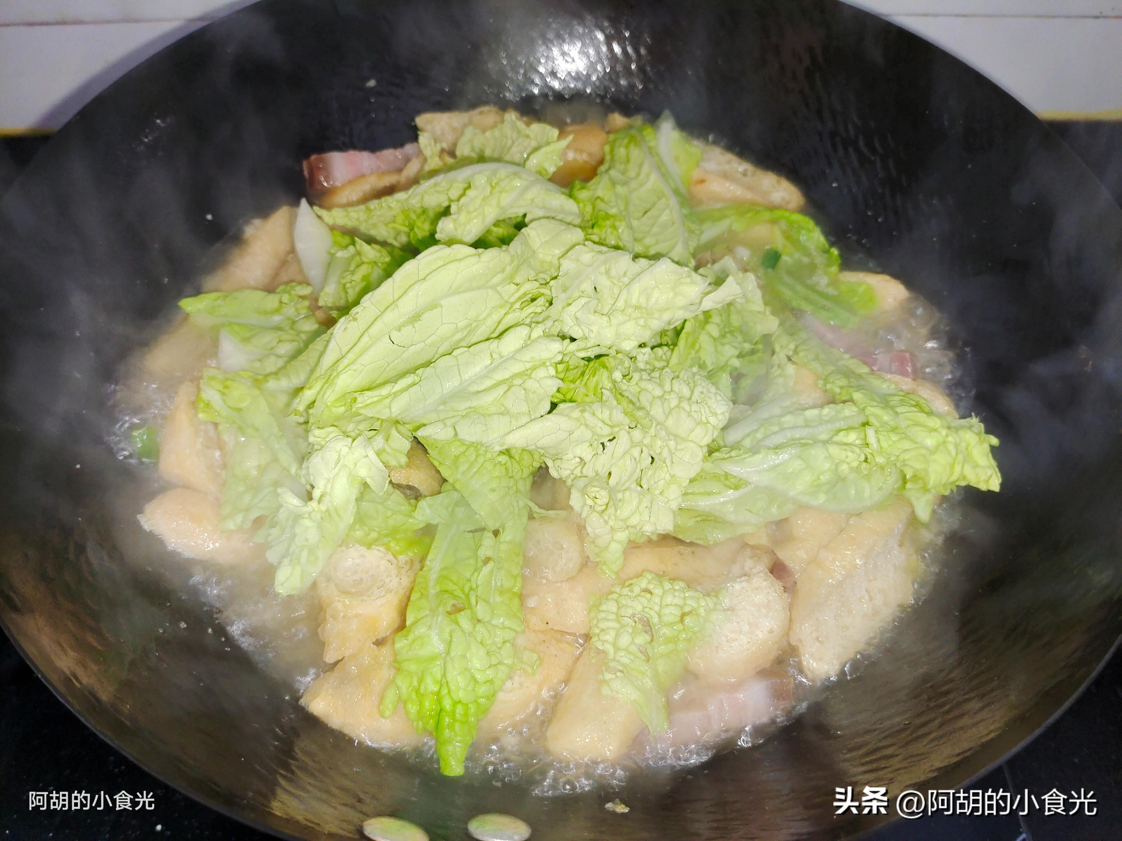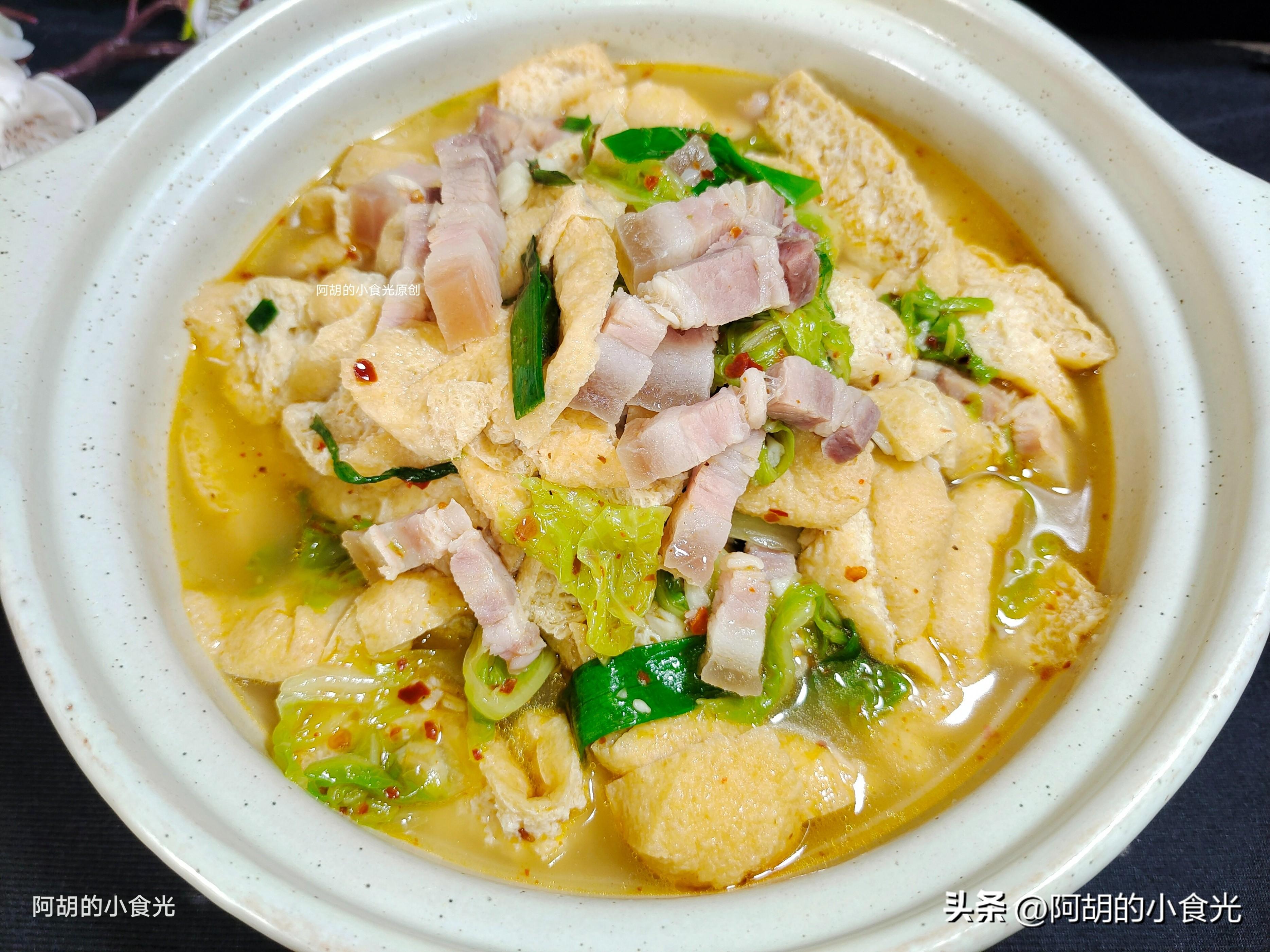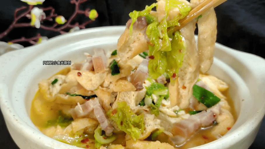 食材很簡單,分別是鹹肉、油豆腐和白菜葉這三種,門道就是這個油豆腐,被油炸過後內部是海綿狀的,可以裝入更多的湯汁,放在湯菜中煮一煮,咬一口就是爆汁,今天搭配鹹肉和少許白菜葉,再來一些辣味,更是有滋有味。