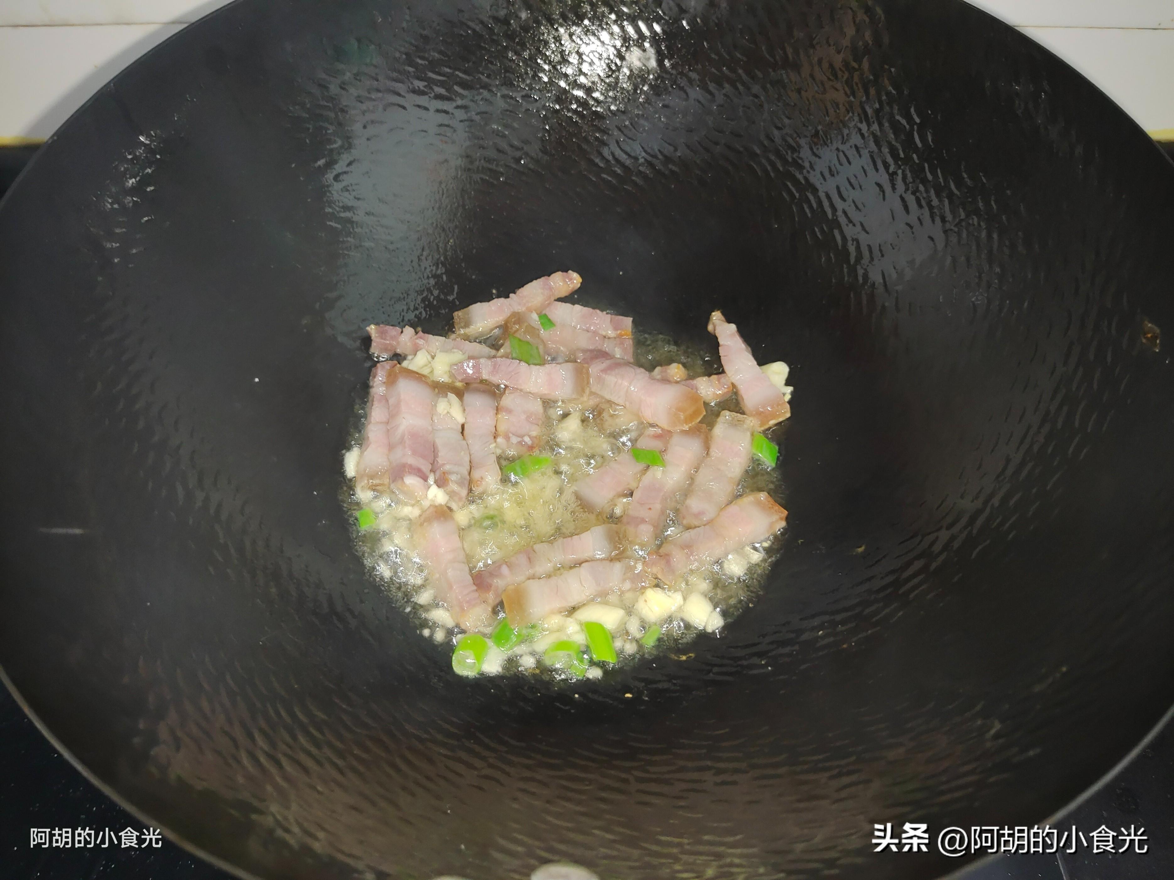 第三步:所有食材基本都備好了,下面就開始進入烹飪主題。小火把鍋烘乾,先淋入一些花生油燒熱,而後保持小火將鹹肉條倒入鍋中炒一炒,炒至其變色出香味時再下入一些蔥蒜炒出香味。