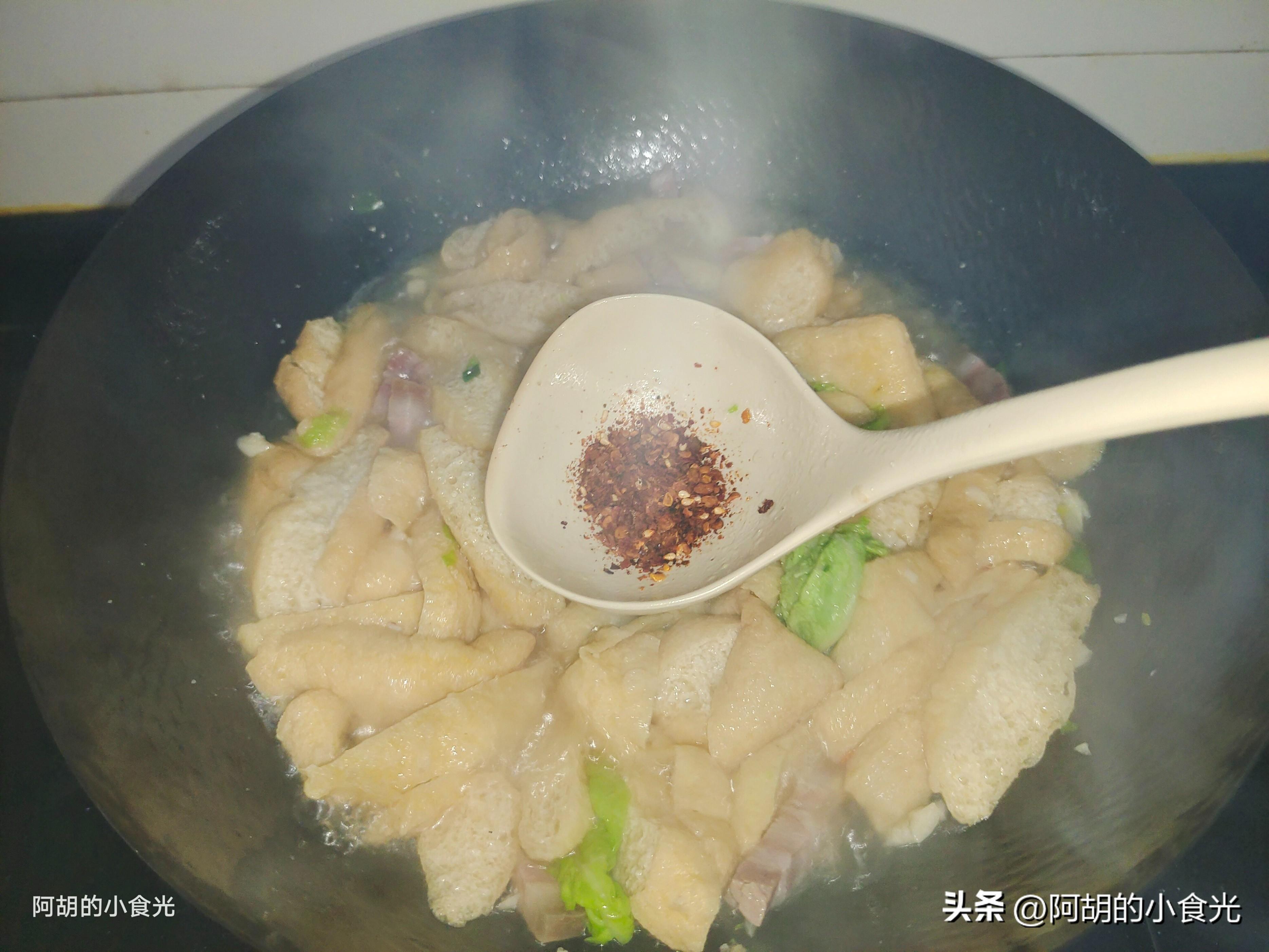 第四步:把油豆腐倒入鍋中,轉爲大火簡單翻炒幾下。而後準備一些開水衝入鍋中,大火煮開煮沸後將白菜葉也倒入鍋中,簡單翻拌使其浸入湯汁中就可以來調味,一些食鹽、白胡椒粉、雞精即可,我喜歡一些微微的辣味,就加入一些辣椒粉炒勻。