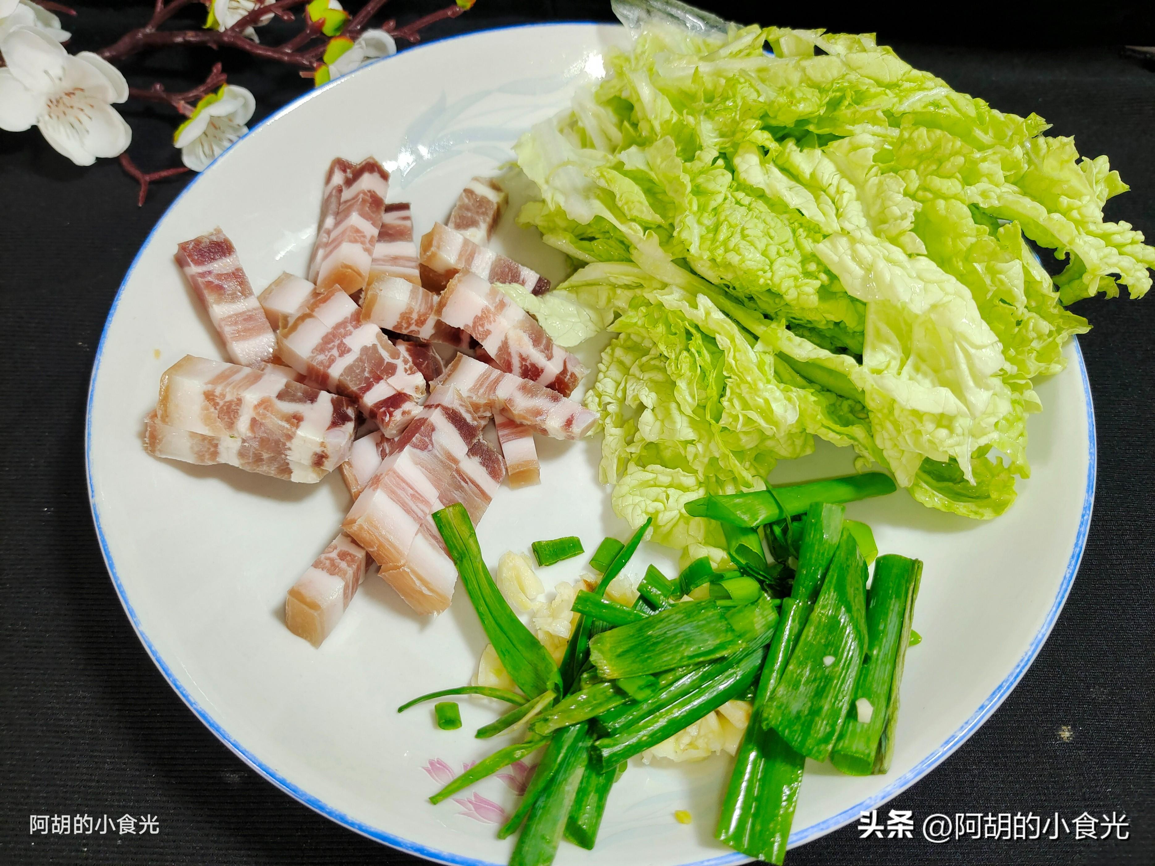 第二步:再來準備一些配菜和小料,最主要的就是這個風乾五花鹹肉,將其切開成小長條待用。還有幾片白菜葉用來搭配,注意此處只使用白菜的嫩葉部分。再準備一些蔥蒜作爲小料,其中蒜末稍微多一些,最後出鍋時也需要加一些。還有就是蔥綠也要多切一些。