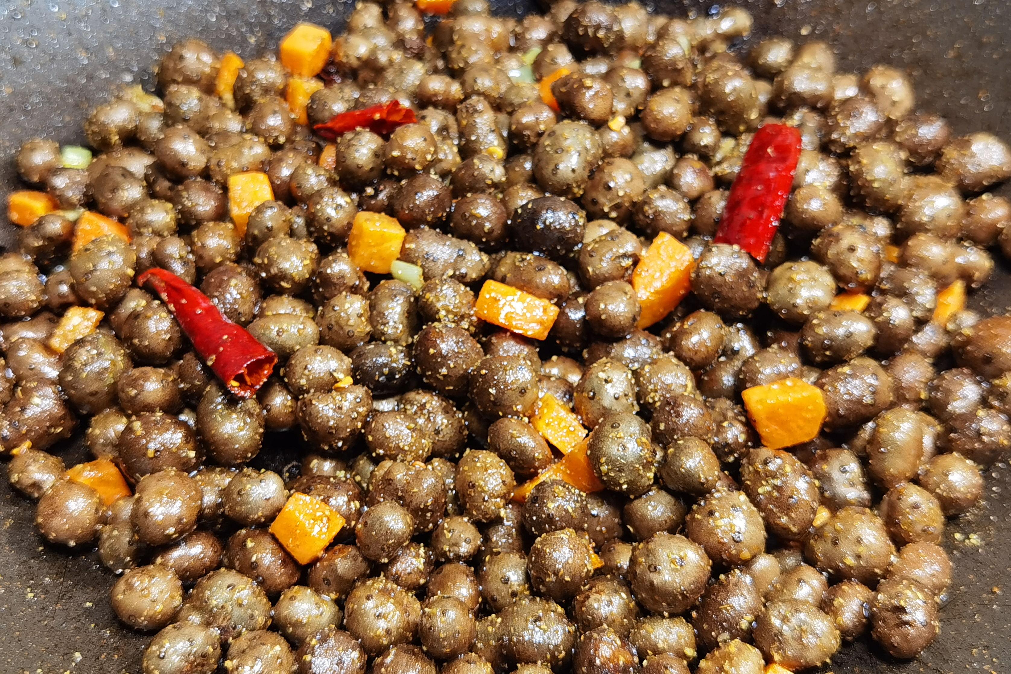 香味出來後,把蒸好的山藥豆“嘩啦”一下倒進鍋裏,轉中大火,快速翻炒,讓每一顆山藥豆都均勻地裹上油和香料的滋味。