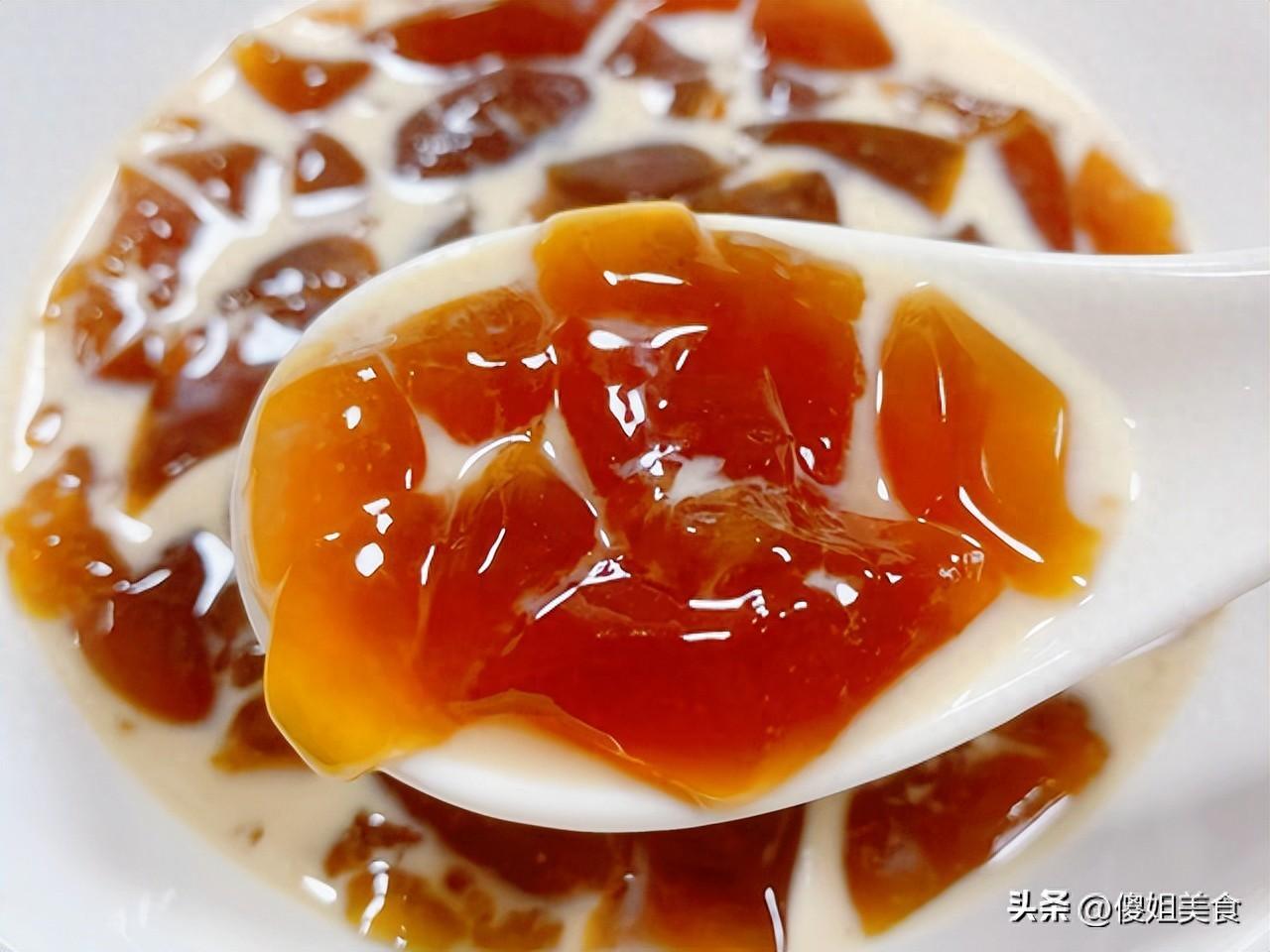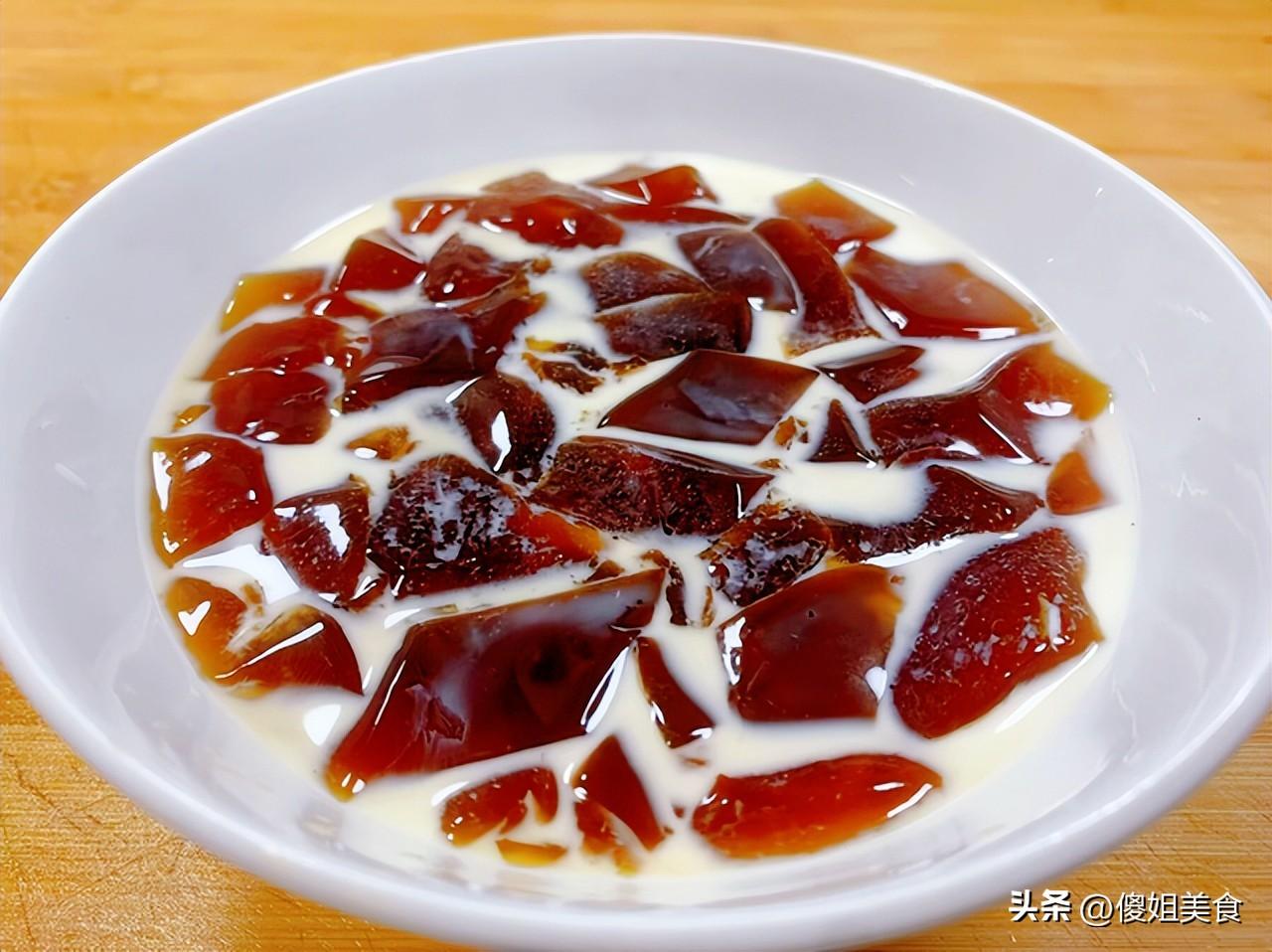 喫的時候,用勺子把涼粉舀成小塊,裝進碗裏,倒入冰鎮的牛奶或者椰奶,喜歡甜一點的可以再加一點點蜂蜜。但我個人覺得,羅漢果自帶的甜味已經足夠了,再加上雪梨的清甜,味道剛剛好。
