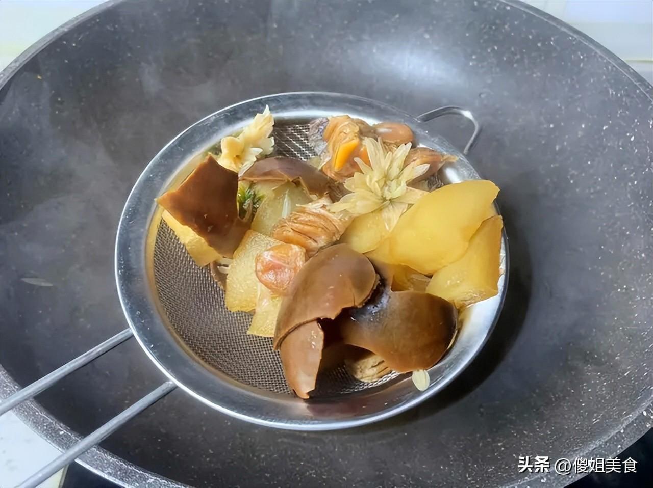 接下來就是最關鍵的一步——把鍋裏的所有食材撈出來,只留下熬好的湯汁。測量一下湯汁有多少,我這次大概得到了500毫升左右的湯汁,按照白涼粉的說明,一般是30克涼粉配500毫升液體,這個比例做出來的涼粉口感最Q彈。