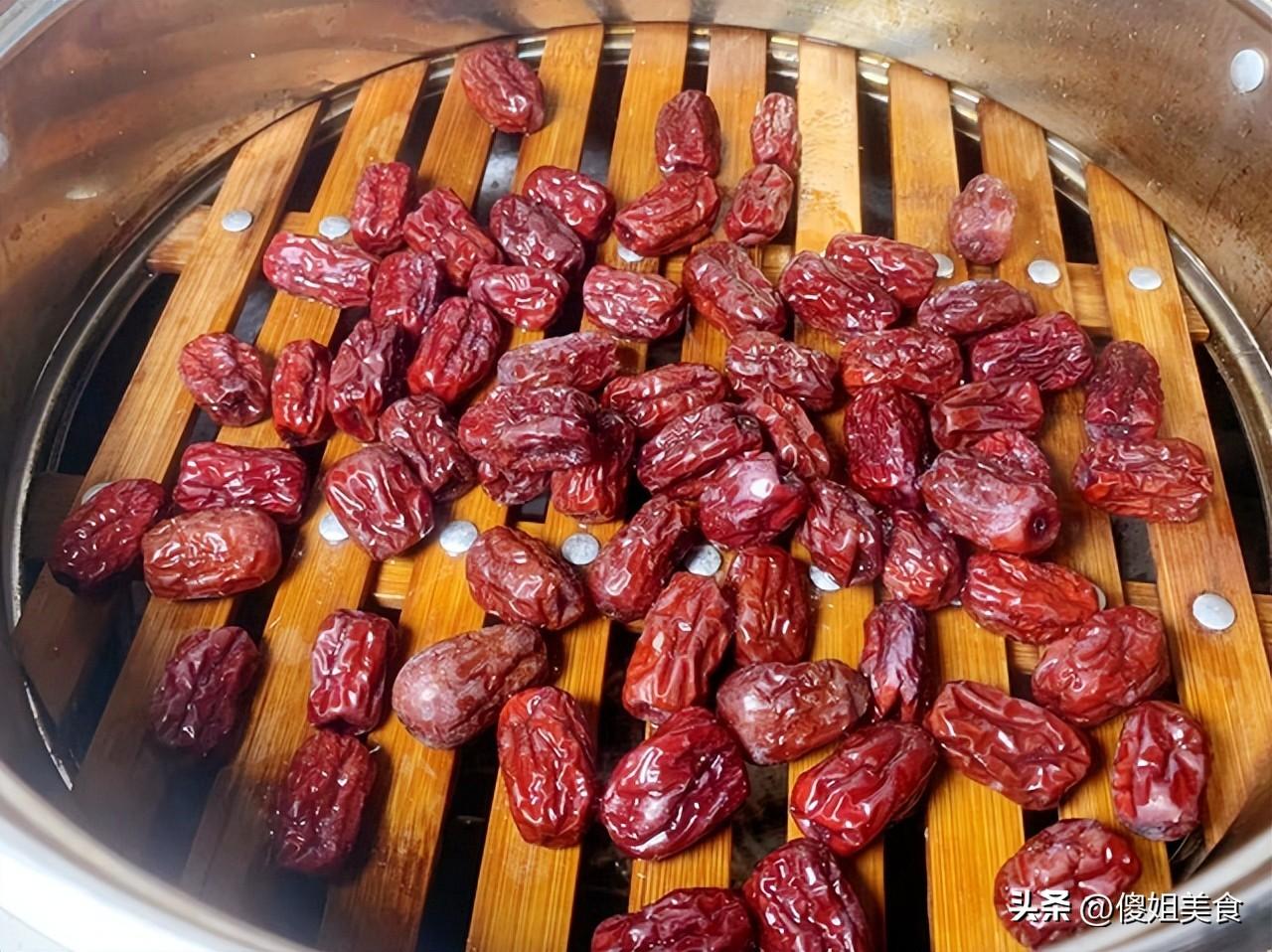 第一步,把紅棗放入清水中,搓洗乾淨,洗好的紅棗放入蒸鍋中,大火蒸上40分鐘。這個步驟很關鍵,蒸過的紅棗會更加香甜軟糯,也方便後續處理。
