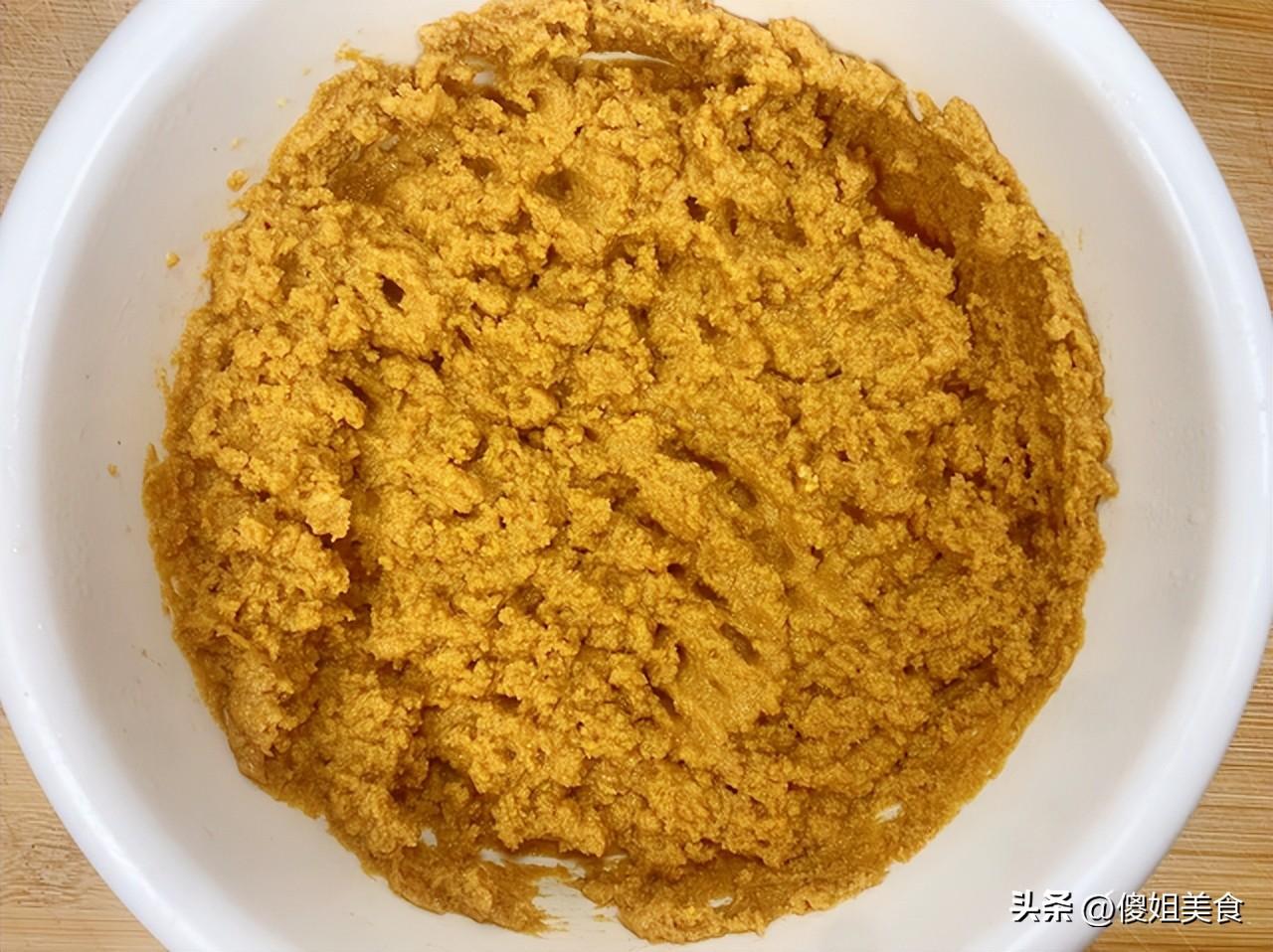 第三步,在棗泥中加入玉米麪,再放入酵母,這裏要特別注意一下,如果棗泥還比較燙,一定要等它涼到溫熱再加酵母,不然高溫會把酵母燙死,影響發酵效果。
