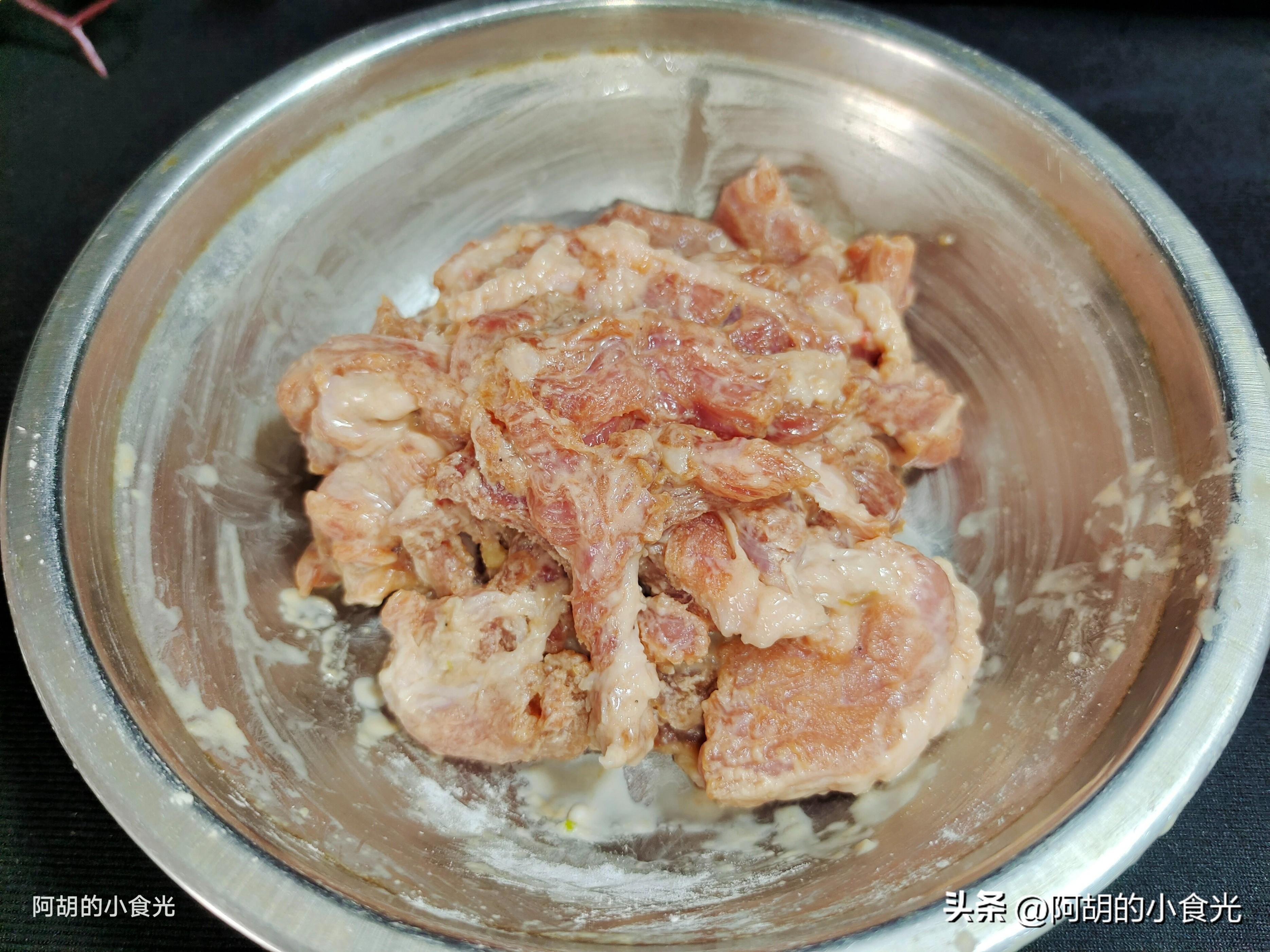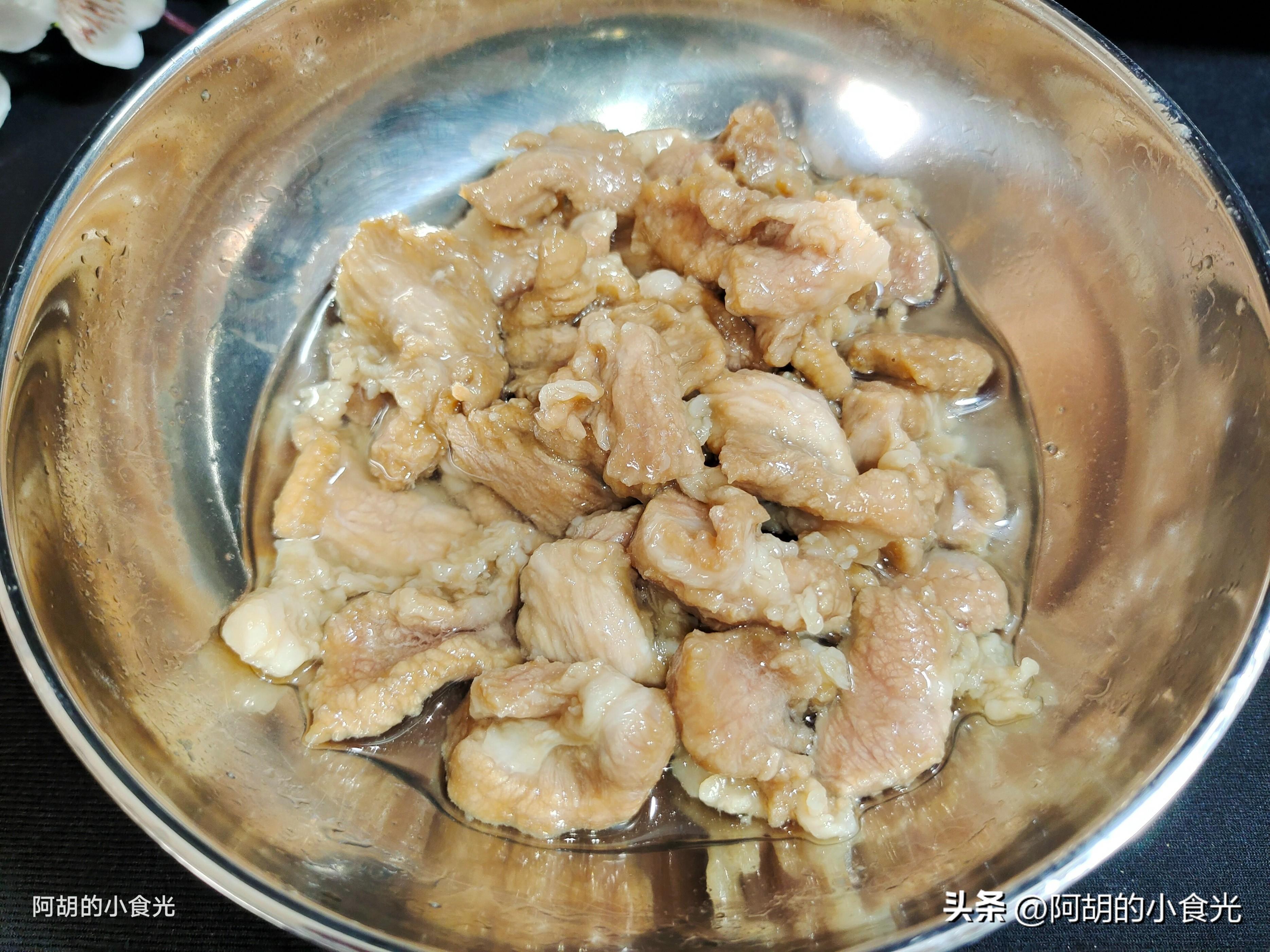 第二步:今天滑肉所用的肉是豬梅頭肉部位,這個部位的瘦肉中有脂肪紋路,即使直接下鍋爆炒也是很嫩的。爲了肉有一些滑嫩的口感,這裏需要進行上漿處理。把瘦肉切片後放入碗中,撒入一些食鹽、生抽和蠔油充分地抓拌均勻,而後往肉片中加入多一些的紅薯澱粉,同樣下手抓勻,如果稍微有些幹就稍微淋入一些清水再抓勻(水不要太多)。要保證肉片都能裹一層粉漿,而且要保證不要有乾粉。處理好後置於一邊醃製十分鐘時間。