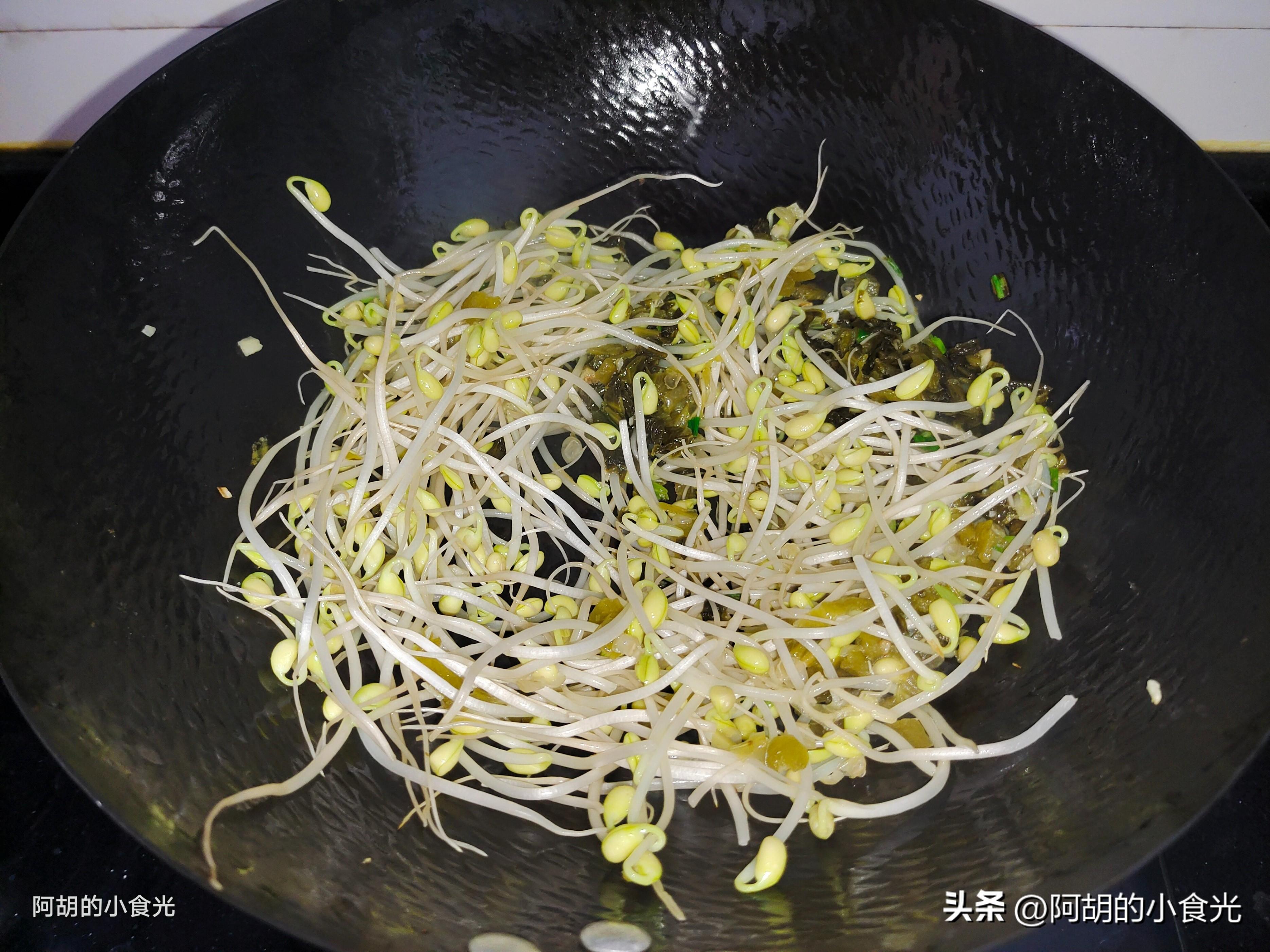 第五步:肉片也準備好後就開始燒湯。鍋烘乾後淋入一些花生油燒熱,把蔥蒜下鍋炒出香味後再把酸菜葉倒入鍋中炒一炒,充分激發出酸菜的香味後就把黃豆芽葉倒入鍋中,轉爲最大火快速翻炒至豆芽微微變軟。