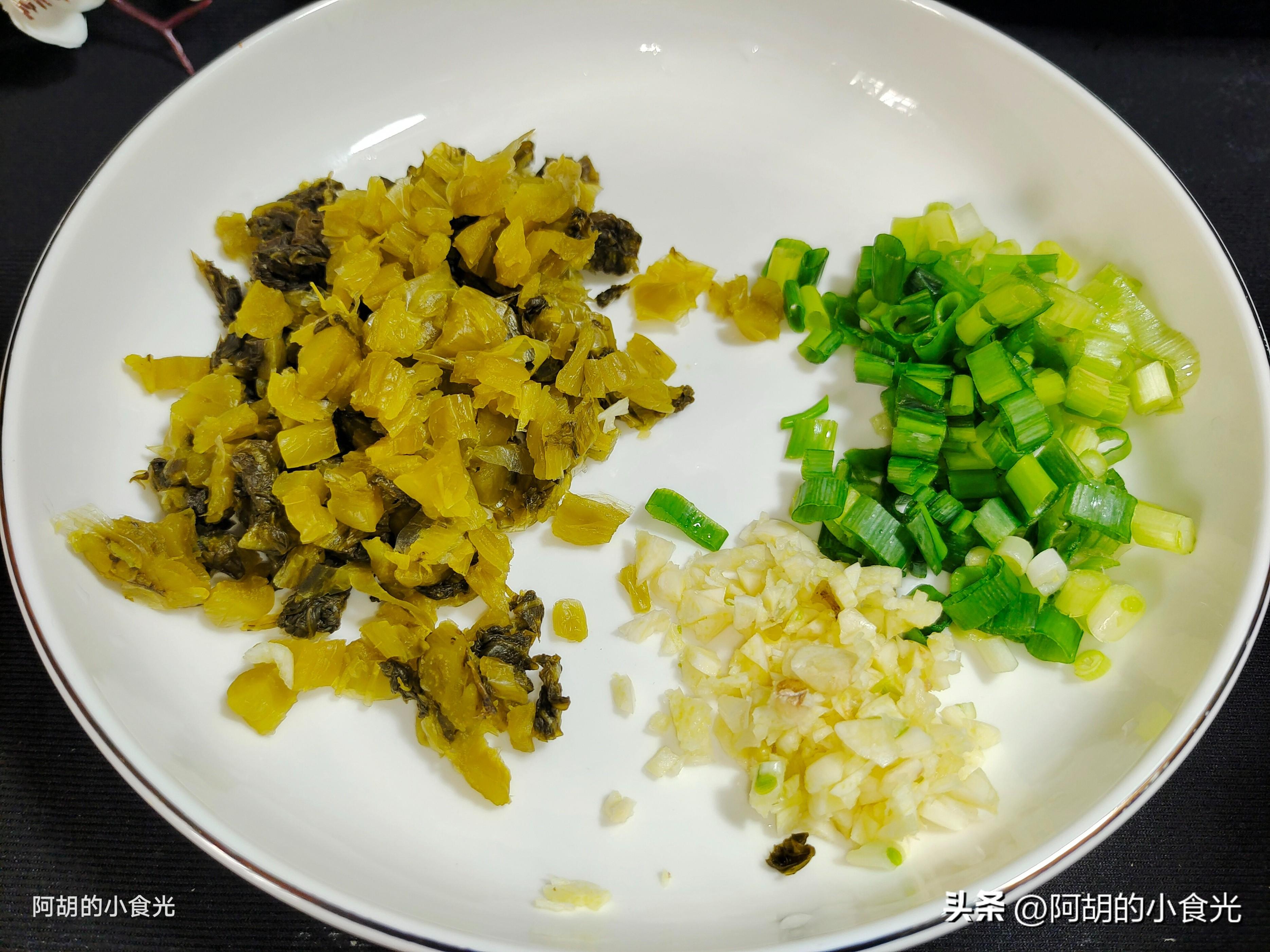 第一步:準備一把黃豆芽,用清水淘洗乾淨,撈出後瀝乾水分置於一邊待用。還有兩片酸菜葉,洗掉鹽分後切碎,今天用的酸菜就是超市購買的袋裝酸菜,含鹽較多需要清洗。再來一些蔥蒜作爲小料使用。