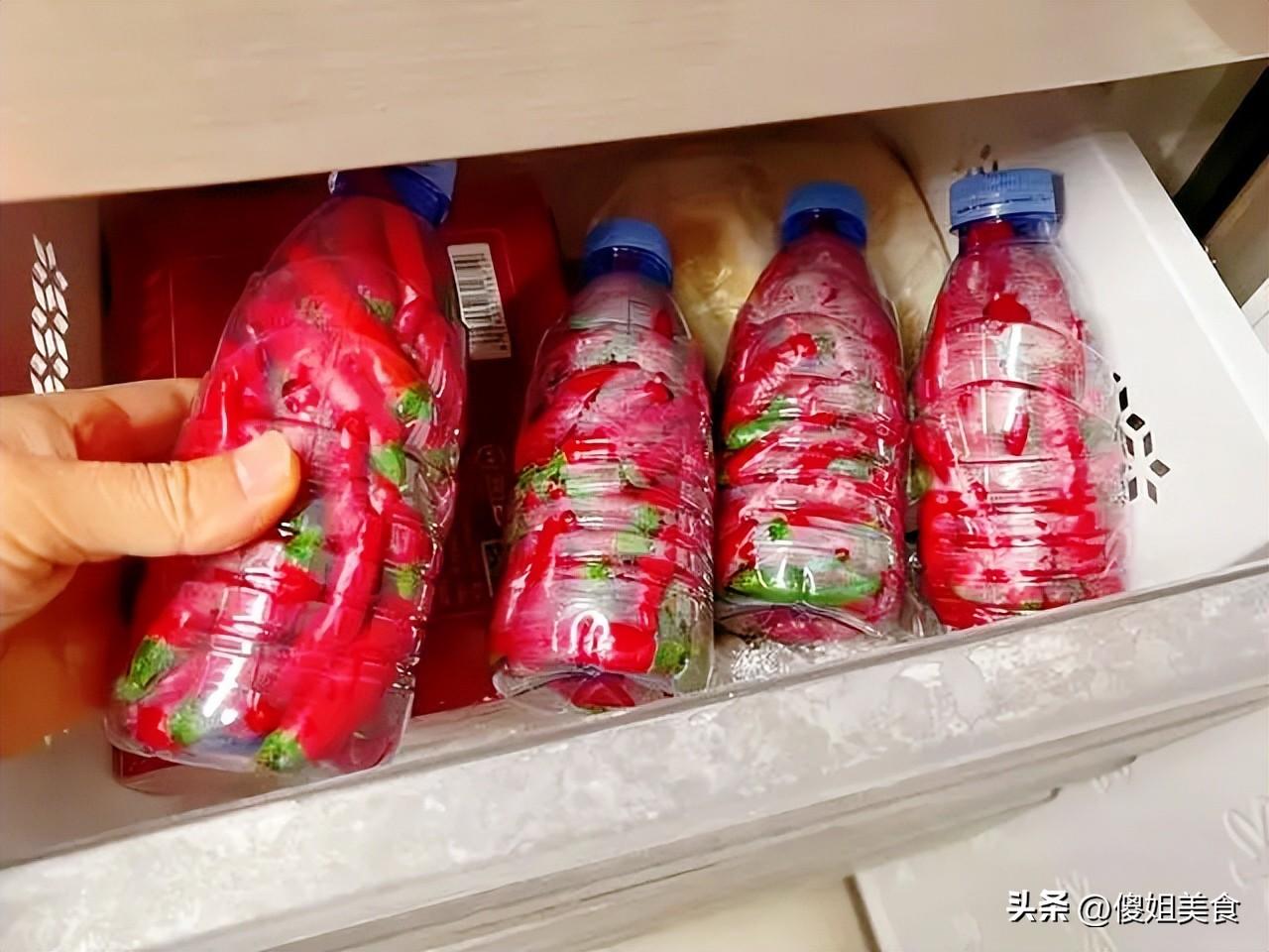 第三步:現在輪到礦泉水瓶登場了,把拌好油的小米辣一個個塞進乾淨的礦泉水瓶裏,裝滿後擰緊瓶蓋。一定要確保瓶子裏外都是乾淨乾燥的,不能有一滴水珠。裝好後,直接放進冷凍室,大功告成,用這種方法保存的小米辣,隨時取出來都像剛買的一樣新鮮,香辣味一點都不會流失。