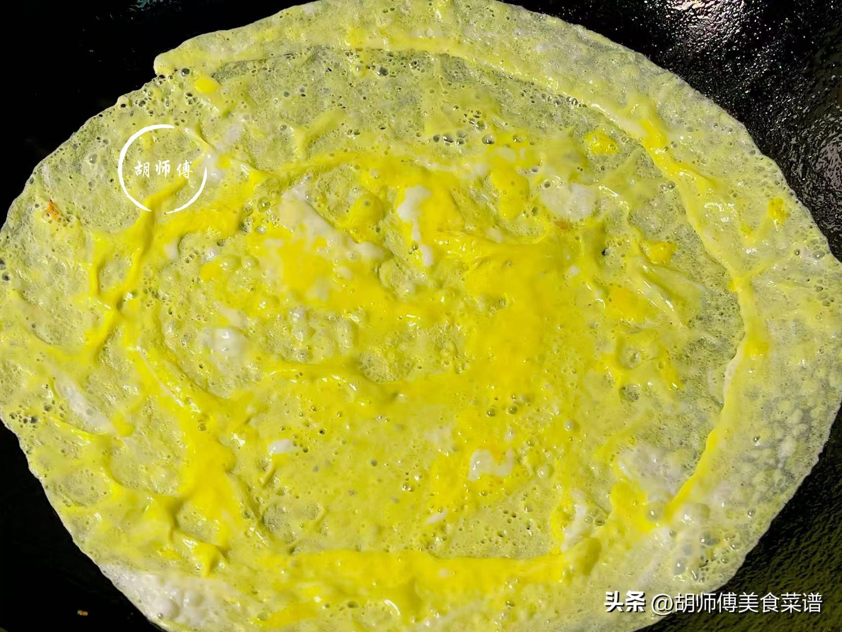 第二步:將雞蛋和一勺澱粉放入碗中攪拌均勻,然後鍋中放入適量油,等鍋燒熱後,把油倒出來,同時關火,等鍋中溫度降低一點後,把蛋液放入鍋中,接着將蛋液均勻的分佈在鍋中,蛋皮就做好了,最後再把蛋皮切成細絲備用。