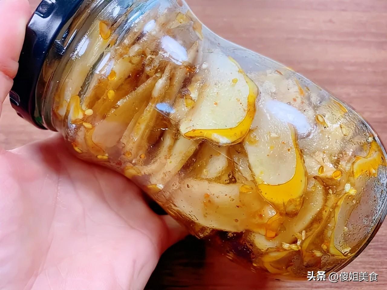 第四步:裝瓶後的洋姜不能馬上喫,需要放入冰箱冷藏醃製三天,這三天裏,洋姜會慢慢吸收料汁的味道,變得脆爽可口。三天後開蓋,那香氣撲鼻而來,保證讓你口水直流。