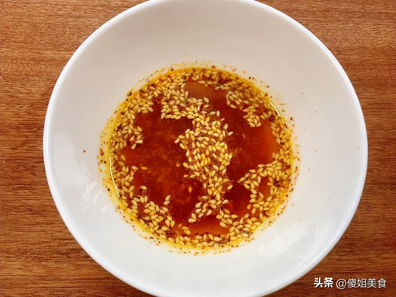 鍋裏燒熱食用油,等到油微微冒煙時,關火稍晾十秒鐘,然後澆在辣椒粉和芝麻上,頓時香氣四溢,攪拌均勻後,再加入陳醋和味極鮮,兩者的比例大概是1:2,調成酸甜適中的料汁。