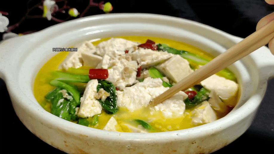 喫多了大魚大肉的可以試一試今天這道菜,主要的食材都很素,豆腐、青菜,另外爲了增添一些好味道我額外加入了少許的“豬油渣”,就用這3樣一起燉個十五分鐘以上,把豆腐燉到內部有蜂窩狀,盛出後還在顫顫巍巍地晃動的程度,絕對的好喫。