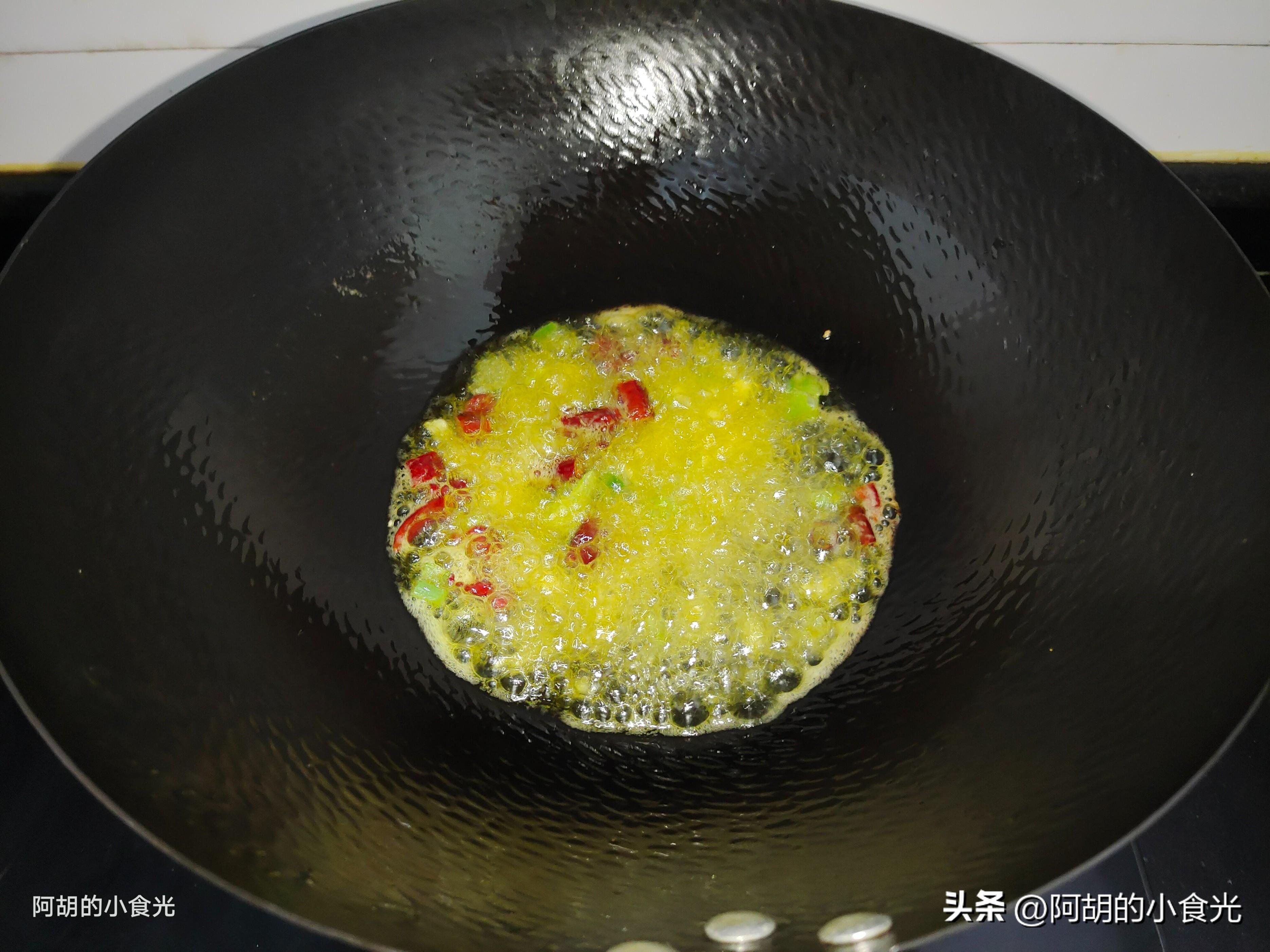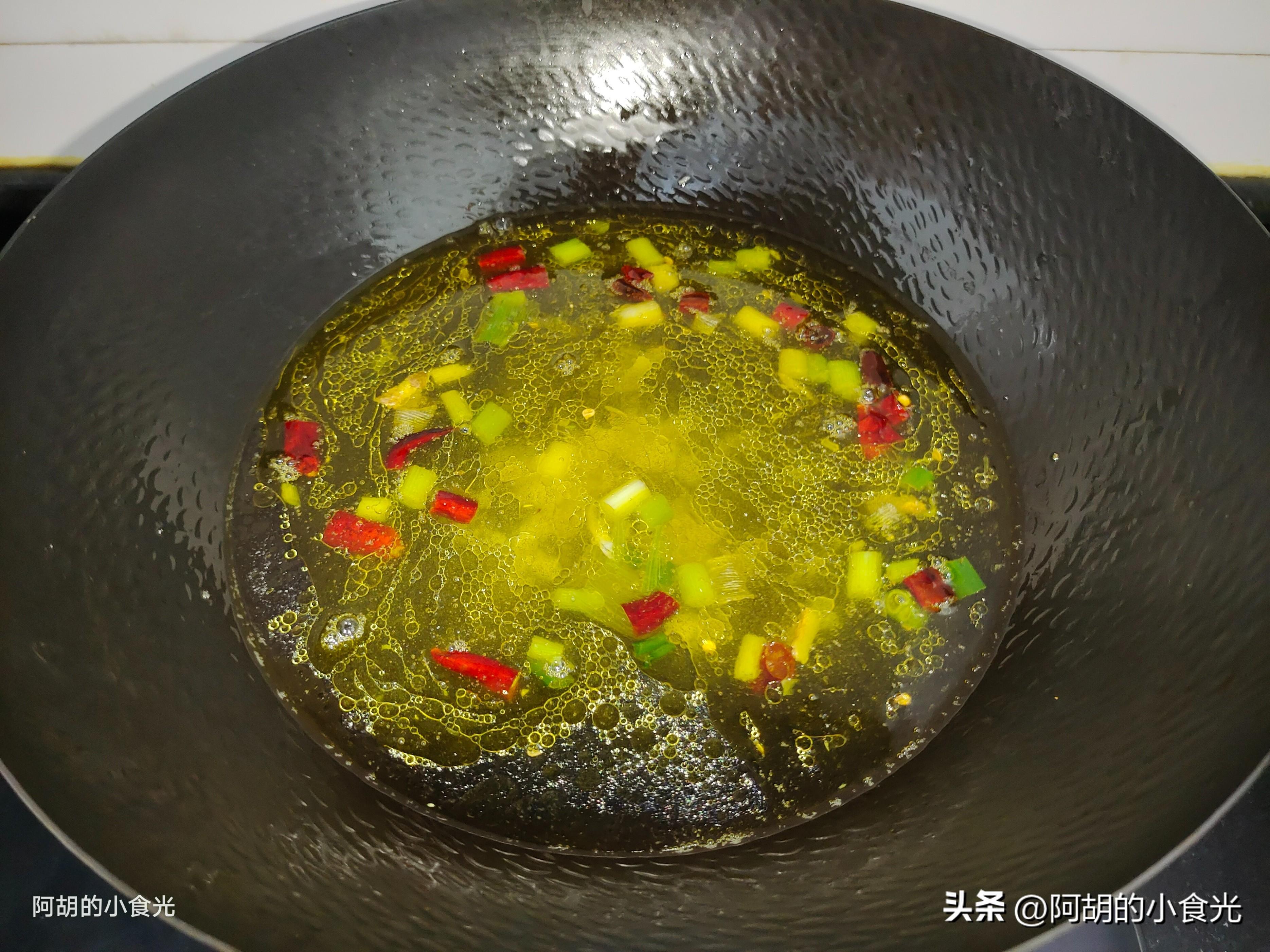 第三步:食材都比較簡單,全部備好後就可以開火烹飪了。鍋烘乾後淋入一些菜籽油小火燒熱,直接把小料蔥薑蒜下鍋先炒出香味,而後再把幹辣椒結下鍋炒一炒,幹椒節遲一點下鍋可以防止被炸糊掉。