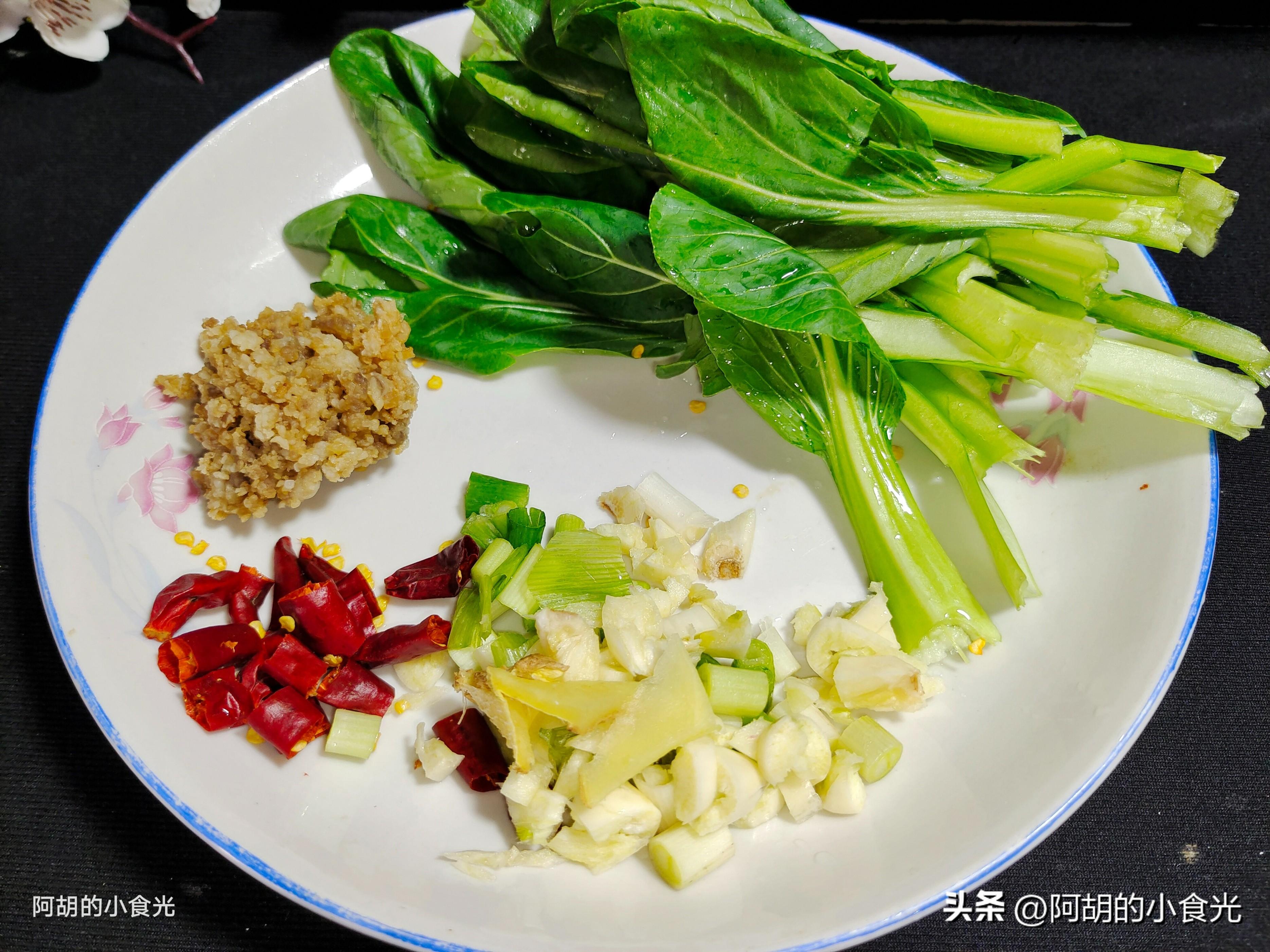 第二步:準備的配菜也是最簡單的,就需要小青菜適量,洗乾淨即可。小料則需要備好蔥薑蒜,建議這道菜小料的用量稍微多一些,還有一個幹辣椒結是絕對少不了的。喜歡的也可以加入一些切碎的豬油渣來一塊燒,味道更好一些。