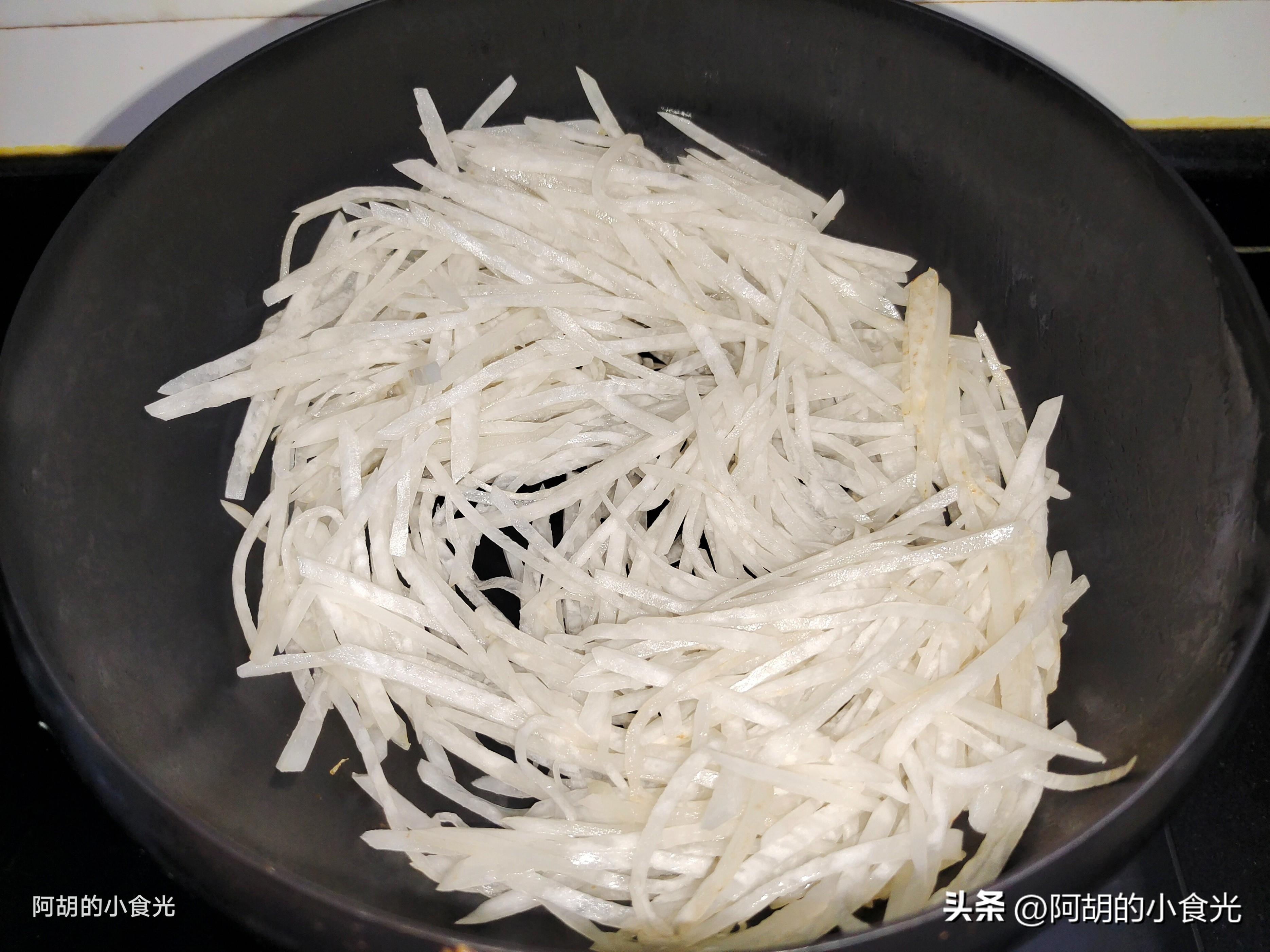 第一步:先來準備半個白蘿蔔,清洗乾淨後去皮,先切片後切絲放入碗中,這道菜也可以用大紅蘿蔔或者青蘿蔔來製作。爲了去除蘿蔔的一些“異味”增加香味,這裏先將其略微炒一下,只要鍋裏來少許的食用油,燒熱後把蘿蔔直接下鍋炒一炒,炒至微微變軟的時候就盛出即可。你也可以將其進行焯水,不過炒過的蘿蔔絲更香,而且煮了更不會碎。