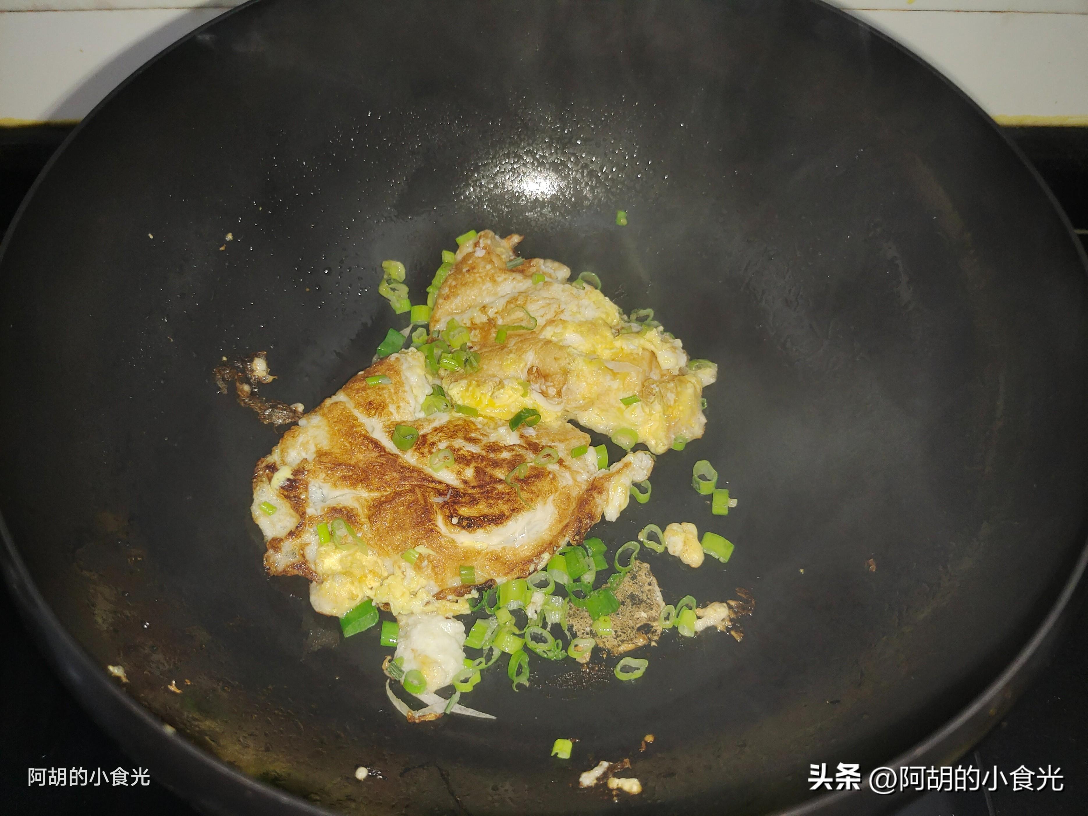 第三步:所有食材都已備好,下面就來開火燒湯。先用小火把鍋烘乾,淋入一些花生油燒熱,而後直接將兩個雞蛋打入鍋中煎一煎,煎成荷包蛋後就撒入一些蔥花炒出香味。