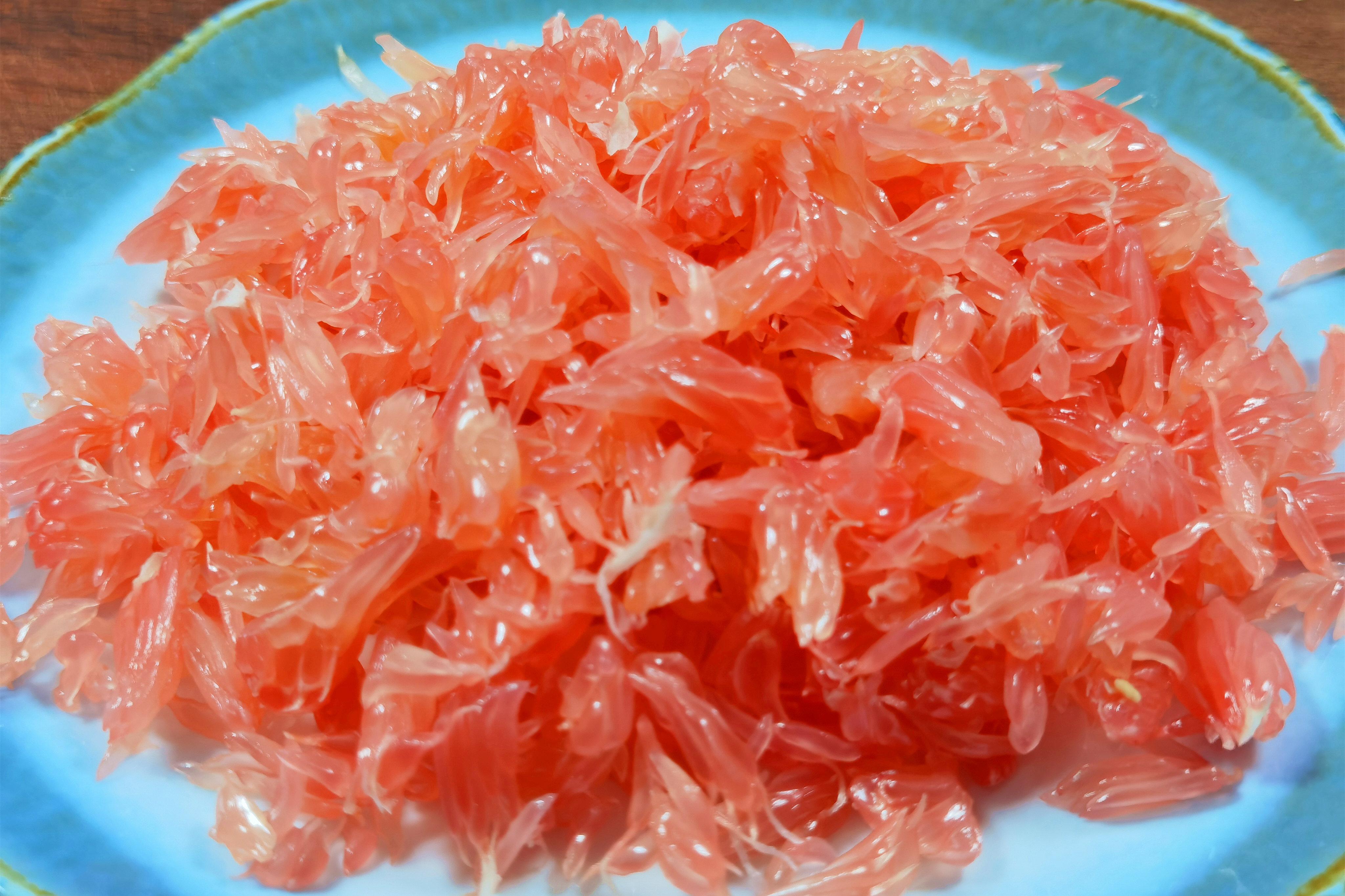 將柚子肉剝出來,去掉白色的筋膜和籽,只留乾淨的果肉。掰成小塊備用。處理得越乾淨,成品的口感就越好。