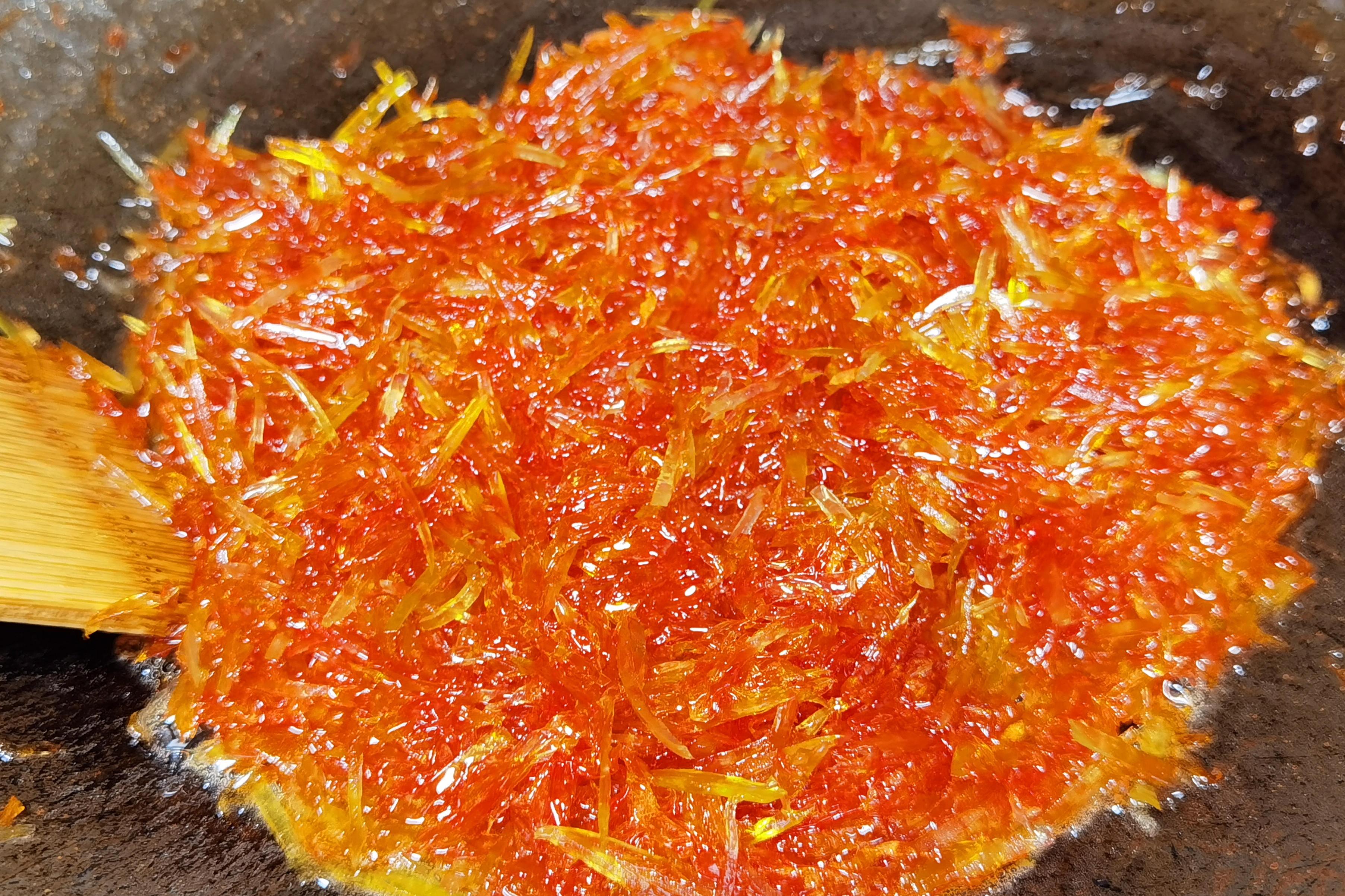 大約熬煮40分鐘到1小時,你會看到鍋裏的水分慢慢變少,柚子皮變得透明,整體變得粘稠,呈深黃色。這時就可以關火,讓其自然冷卻。