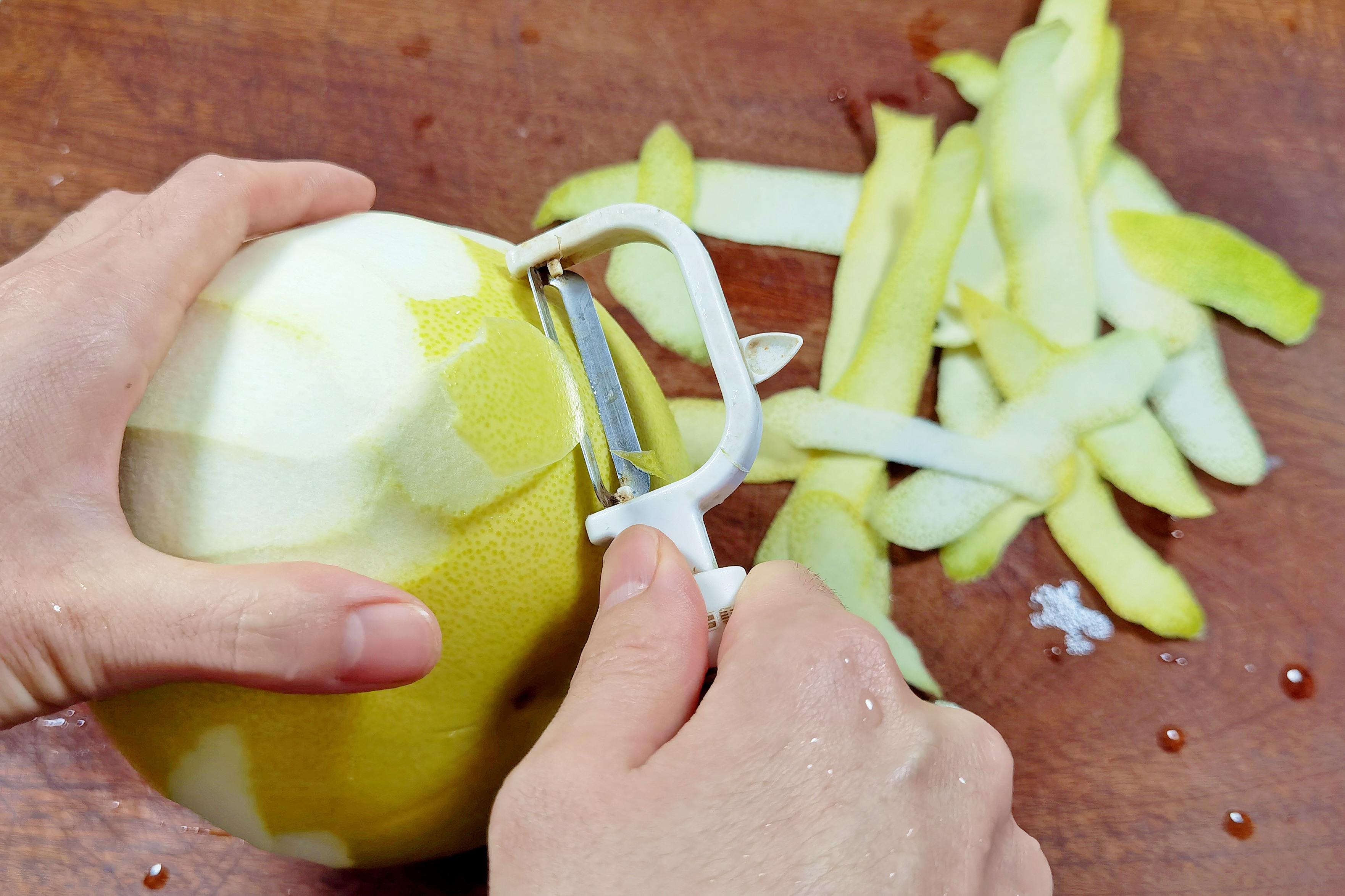 這是最關鍵的一步!我們用削皮刀將柚子黃色的外皮薄薄地削下來。只要黃色的部分,白色的瓤是苦味的主要來源,儘量去掉。