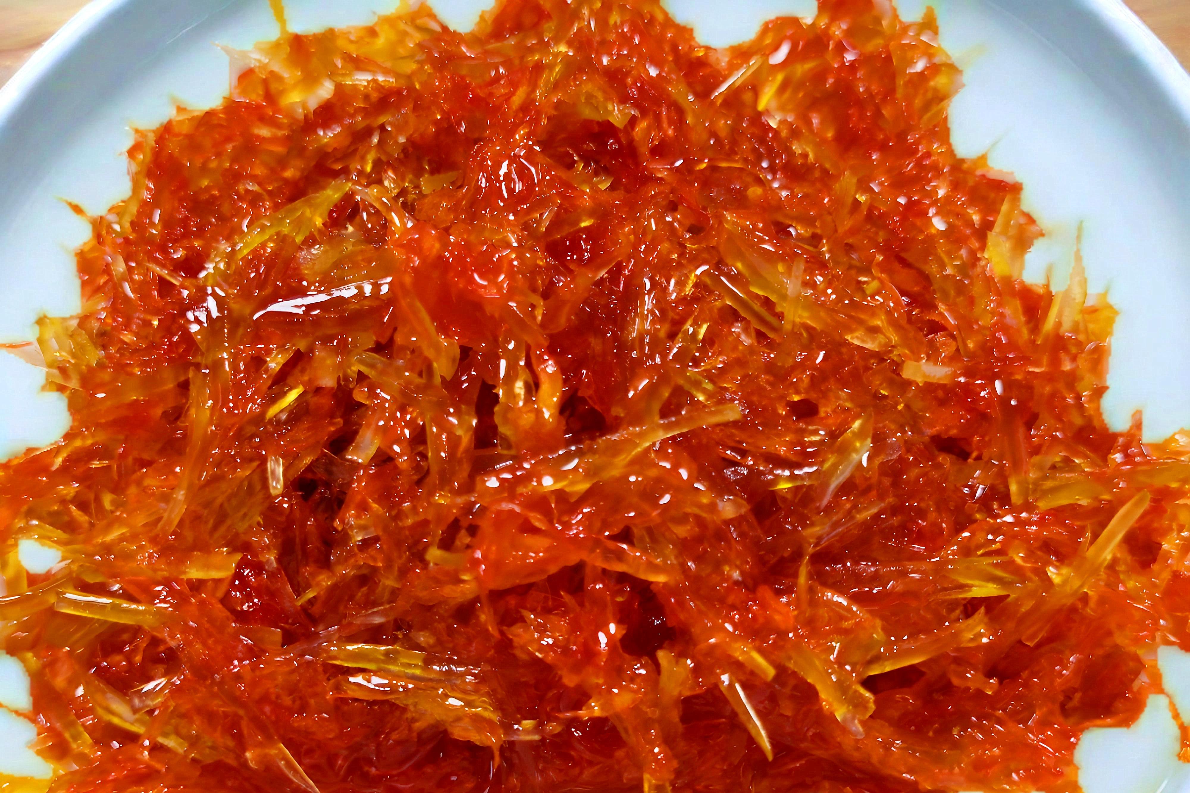 將削下來的黃色柚子皮切成細絲,越細越好。然後放入淡鹽水中浸泡30分鐘,或者下鍋用鹽水煮5分鐘,撈出瀝乾。這個步驟能有效去除大部分苦澀味。