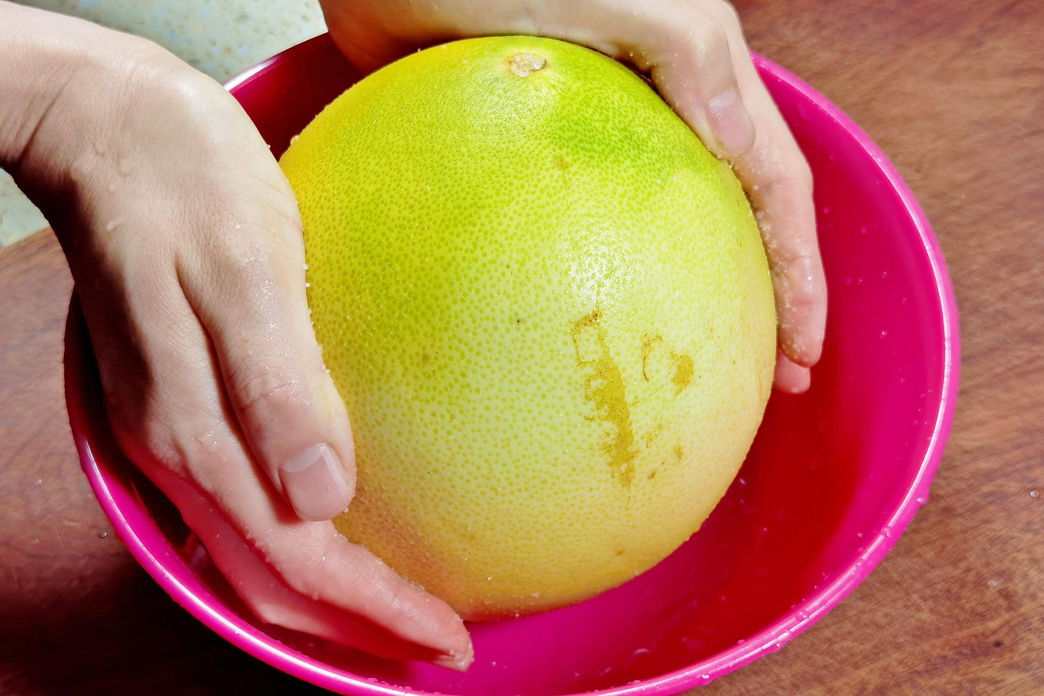 柚子表面可能有一層蠟或殘留,咱們先把它洗乾淨。在柚子皮上撒上一層鹽,用手仔細揉搓每一個角落,大約搓一分鐘。然後用清水沖洗乾淨,這樣能有效去除雜質,還能讓柚子皮的香味更易釋放。