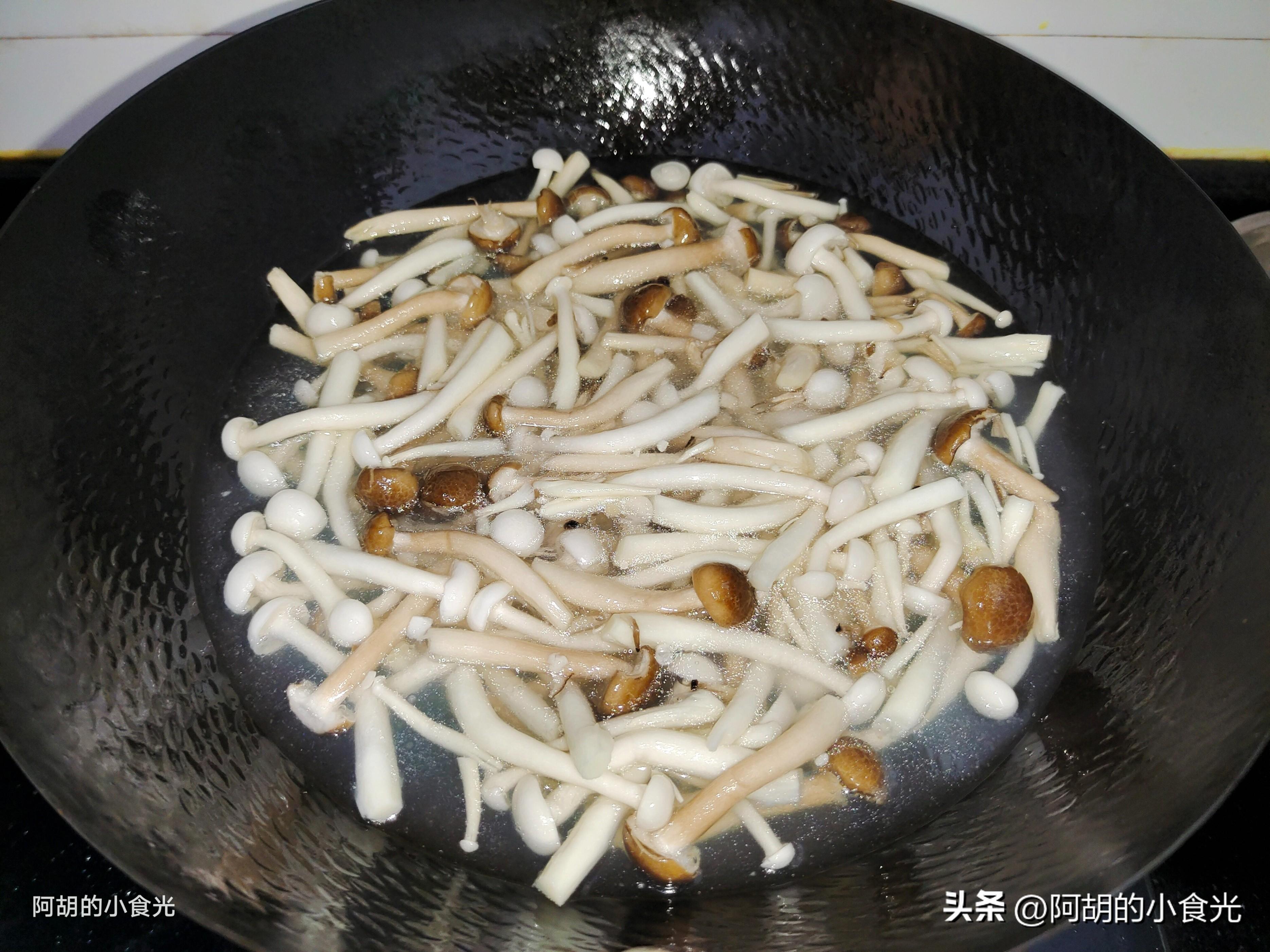 第二步:蘑菇就用蟹味菇和白玉菇兩種了,把蘑菇的根部切掉,而後在用清水淘洗乾淨。再開水下鍋焯燙兩分鐘,撈出後置於一邊瀝一瀝水分待用。另再準備青紅椒各一個,剖開去掉辣椒籽後切塊備用,再來一些蔥薑蒜作爲小料使用,喜歡辣味的也可以在小料中添入幾個幹辣椒節。