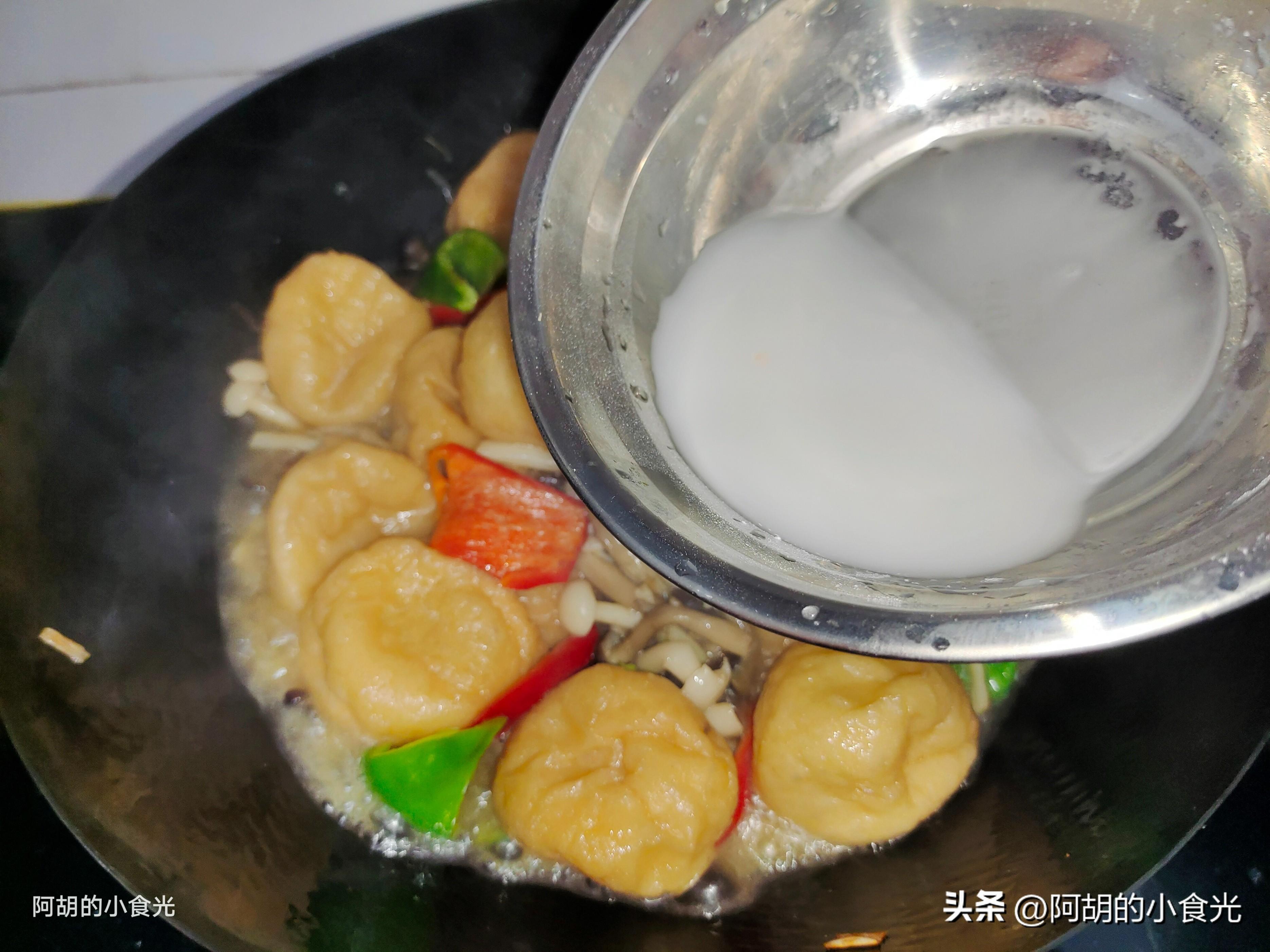 第五步:時間到後取出青紅椒塊倒入鍋中,保持大火先炒一炒激發出青紅椒的香味,最後取出用涼水稀釋的澱粉水淋入鍋中,同時鍋內仍要保持大火,用勺子翻炒一下讓剩下的湯汁濃稠起來可以掛在食材表面的程度即可出鍋。魚腐吸收了湯汁的滋味,鮮滑又可口,還有菌菇的滑嫩,讓這道菜清爽中又不失開胃的作用,不知道喫什麼的時候可以試一試這道菜的搭配。