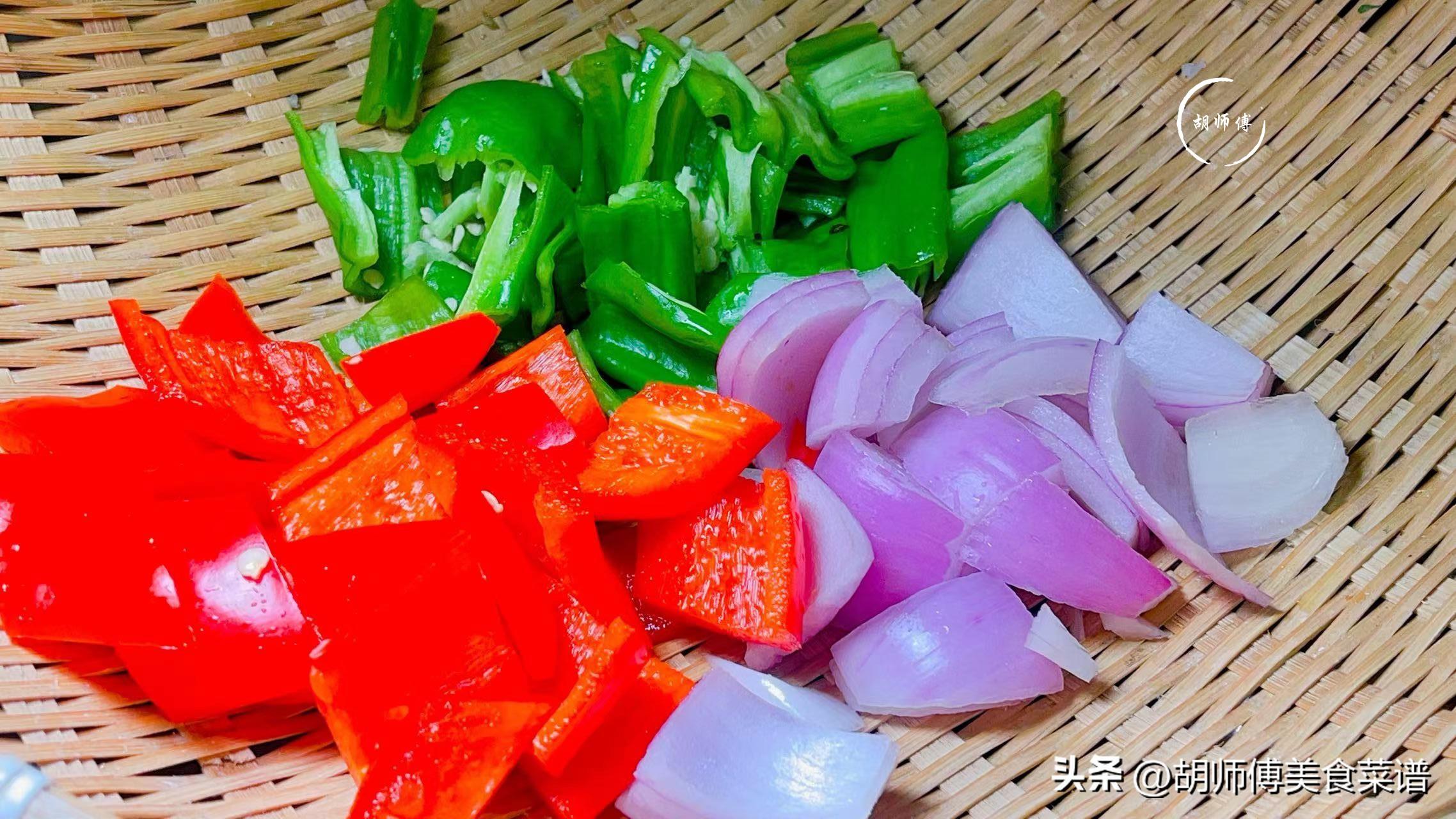 第一步:把滷牛肉切成0.2-0.3釐米厚的片狀,然後將青紅椒、洋蔥都洗淨,接着再把他們切成小塊備用。