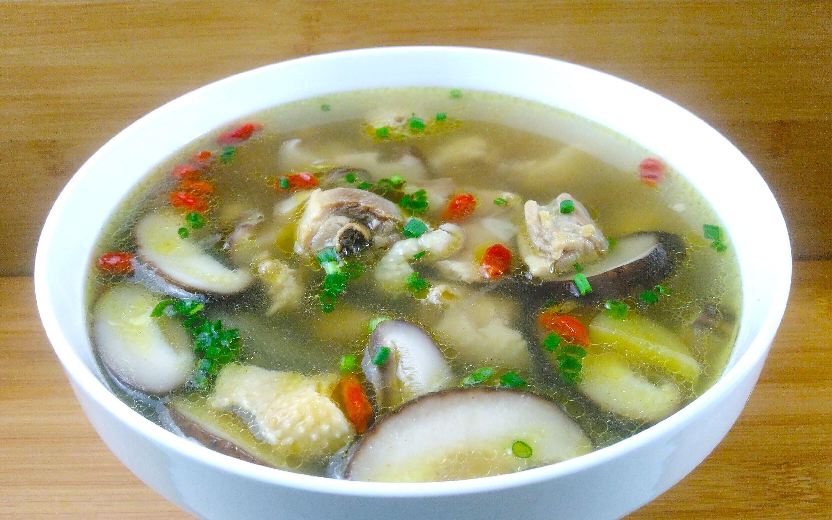 食材:香菇6個,母雞肉半隻,鹽, 姜,蔥,胡椒粉