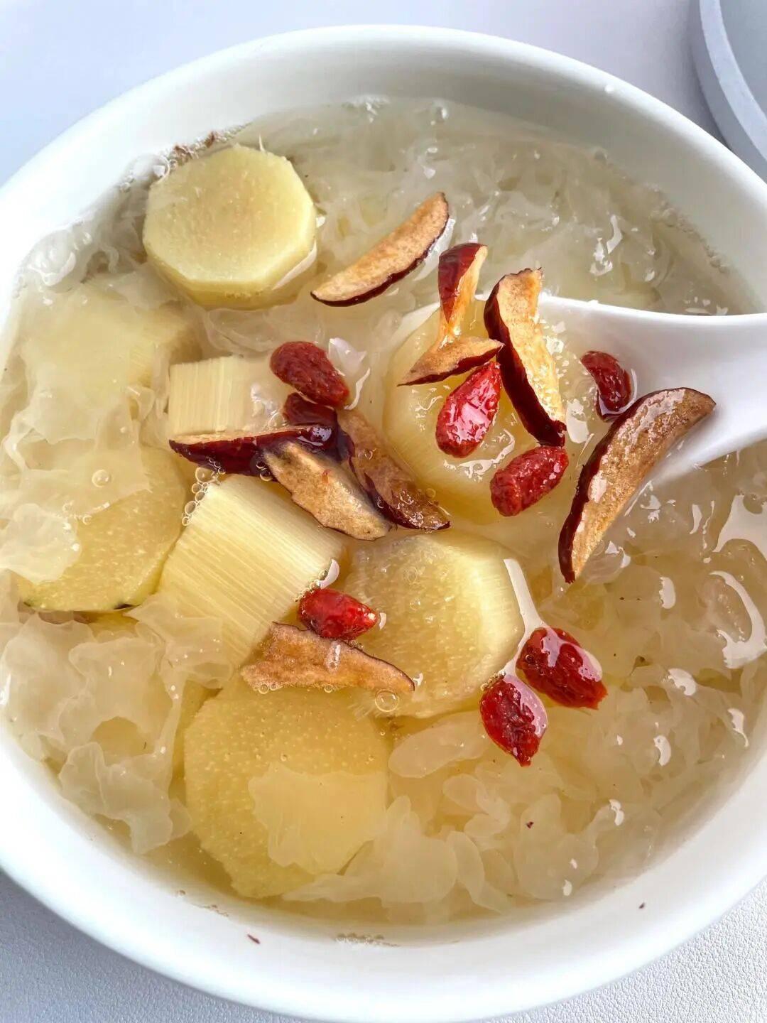 食材:銀耳1朵,甘蔗2節,蓮子,百合,冰糖,大棗