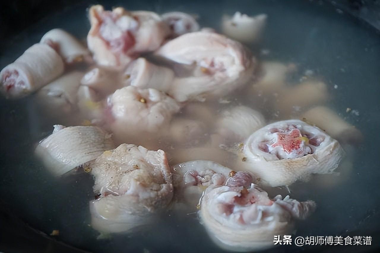 第一步:首先將豬尾巴燒一下,燒掉表面毛後,用鋼絲球將燒黑的部位刷洗乾淨,接着再把豬尾巴剁成小段,最後將豬尾巴和適量水、白酒放入鍋中,大火將豬尾巴焯水10分鐘後撈出,沖洗乾淨備用。