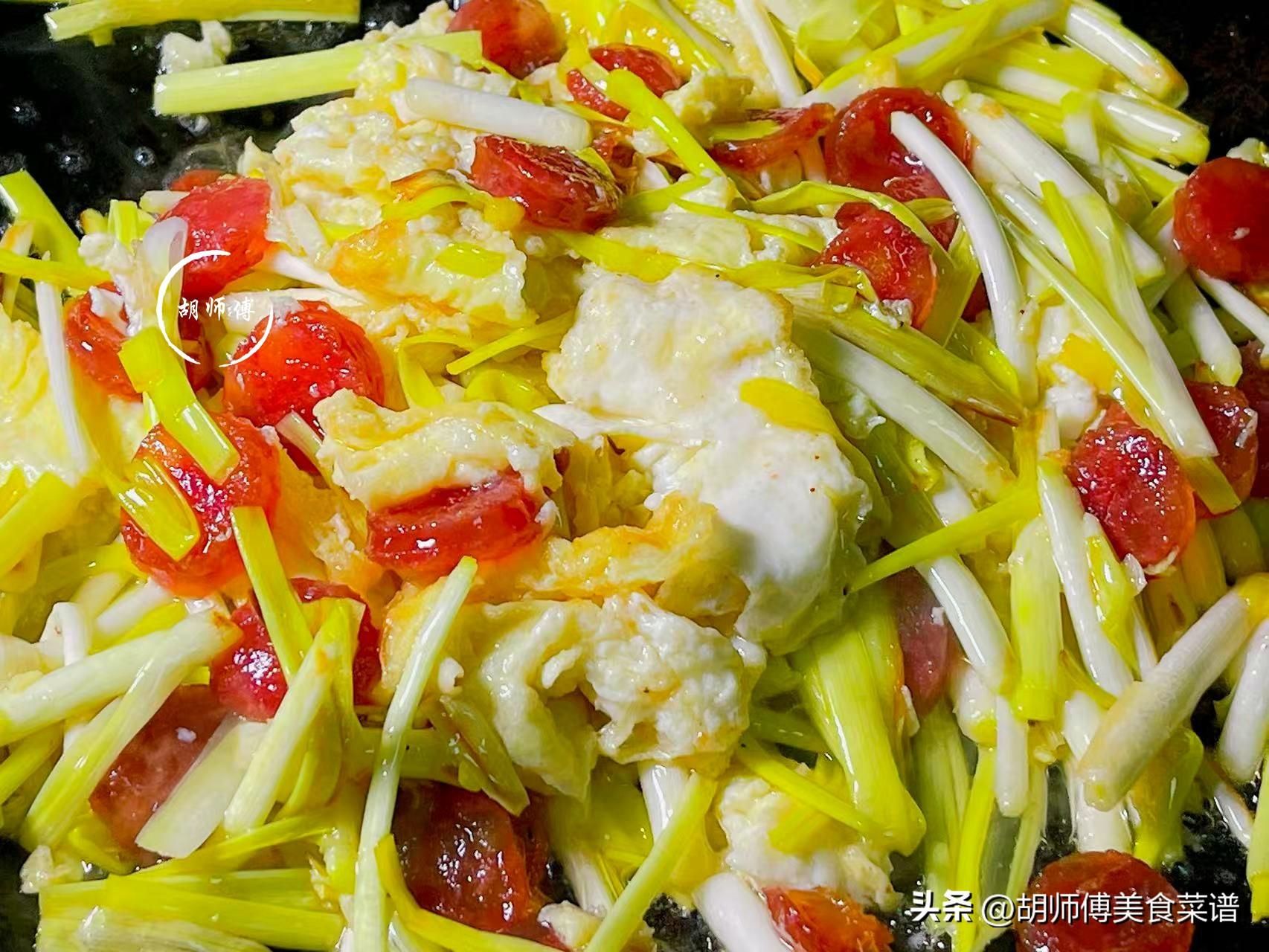 第四步:把切好的韭黃放入鍋中,大火將韭黃炒的斷生後,再把雞蛋、胡椒粉、食鹽放入鍋中炒勻,最後再把甜腸放入鍋中炒勻即可食用。
