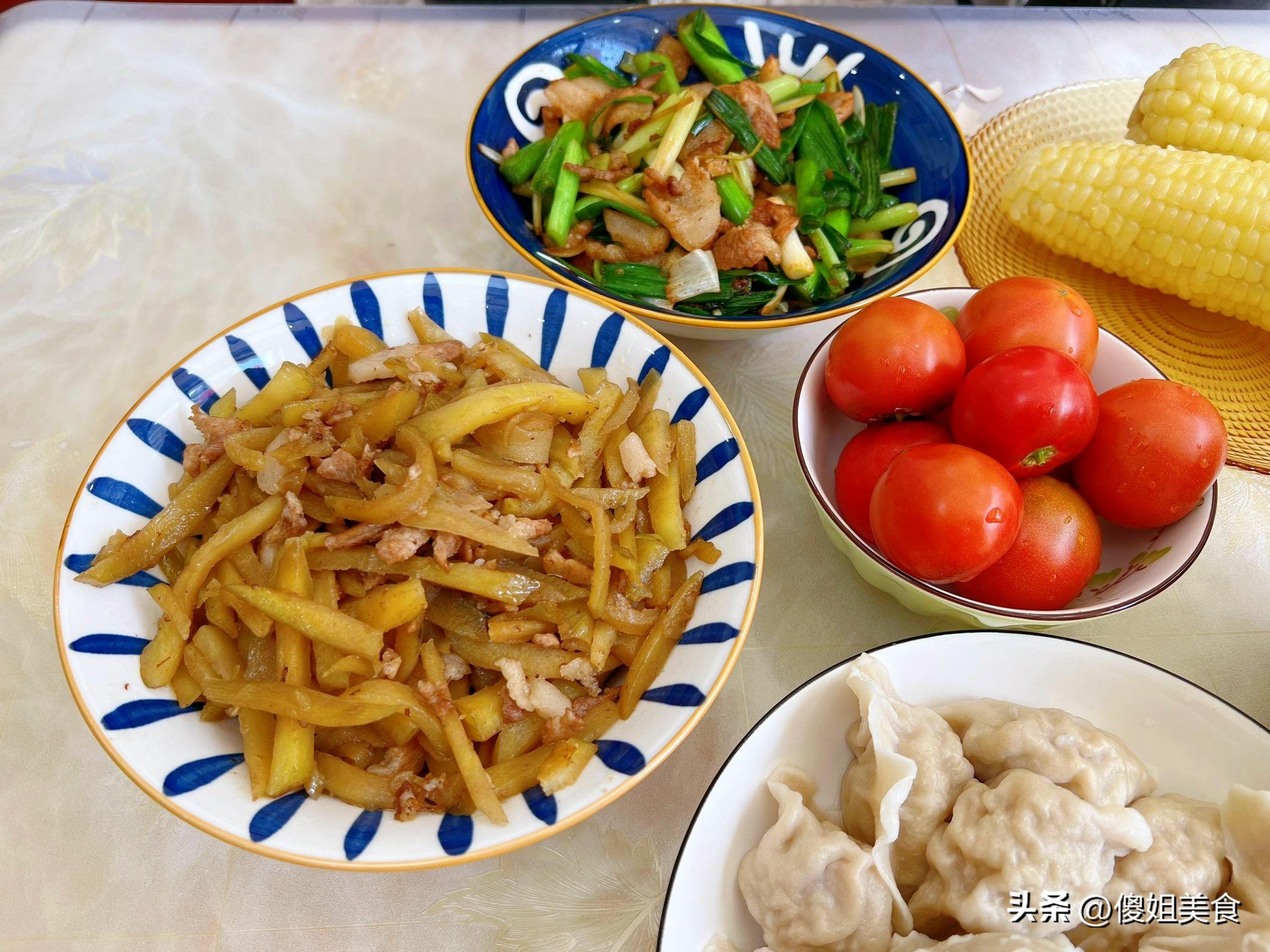不到一小時,午餐全上桌了,熱騰騰的餃子皮薄餡大,咬一口,湯汁差點濺出來;土豆條炒肉鹹香適口,饅頭蘸着菜汁喫,絕配;蒜苗炒肉清香撲鼻,玉米帶着自然的甜香。倆人喫得心滿意足,老公直說比外面飯店好喫多了。其實做飯不麻煩,麻煩的是日復一日的將就,偶爾花點時間,做一頓合心意的飯菜,是對自己、對家人最好的款待。
