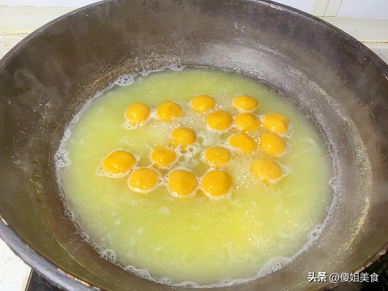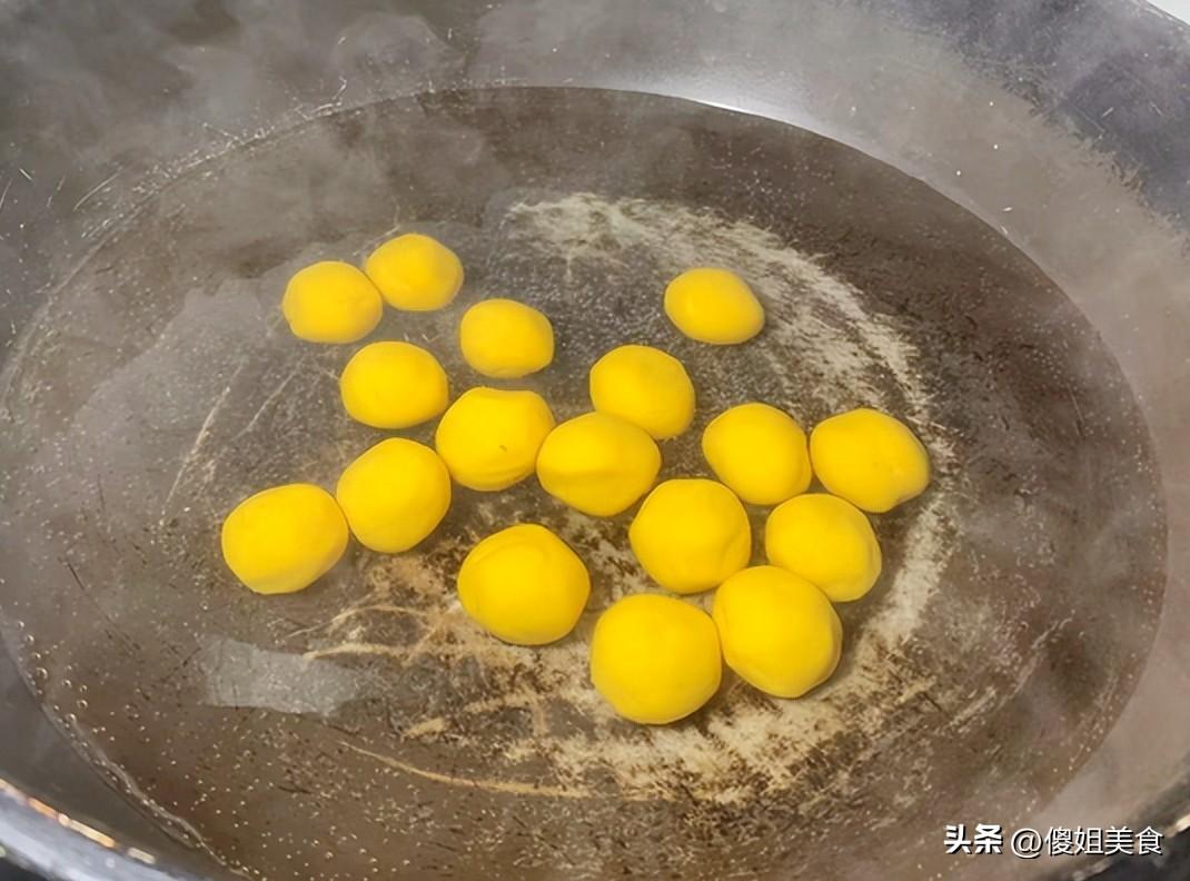 4、鍋裏燒開水,把搓好的南瓜丸子先下鍋煮一分鐘左右,看到丸子全都漂起來,就說明熟透了。這時,再把我們準備好的西米倒進去,稍微攪拌一下。因爲西米已經是熟的了,這一步主要是爲了讓它和丸子一起熱透。眼看着西米在清澈的水中重新變得晶瑩剔透,和金黃的小丸子相互映襯,特別好看。