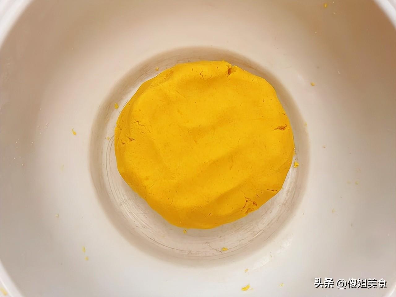 2、把南瓜去皮去籽,切成薄片,越薄越容易蒸熟,放進蒸鍋裏大火蒸15分鐘,用筷子輕輕一戳就透,說明熟透了。蒸好的南瓜壓成泥,然後一點點加入糯米粉,不要一次全倒進去,因爲不同南瓜含水量不同,需要的糯米粉量也不一樣,邊加邊攪拌,直到能揉成不粘手的麪糰。
