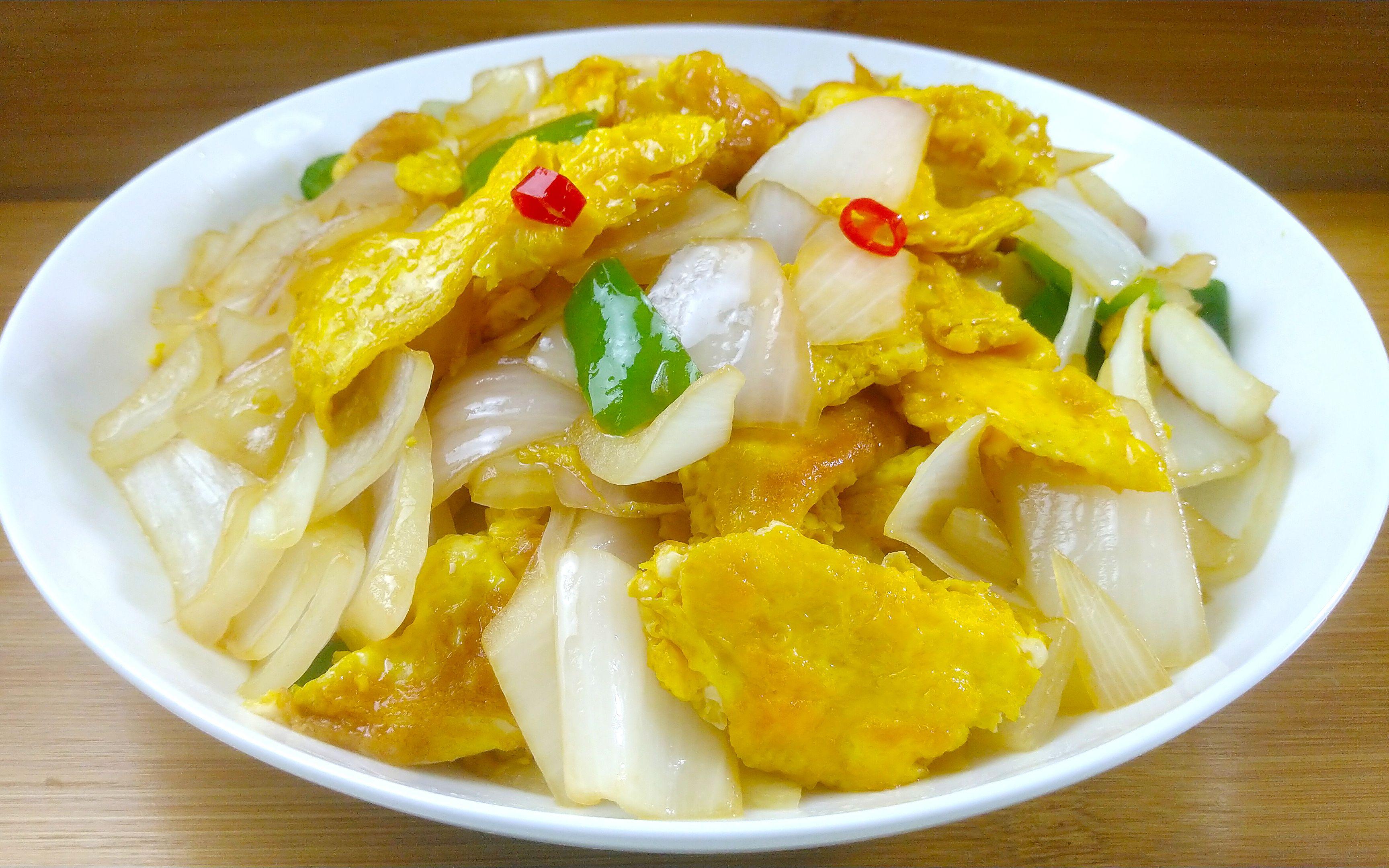 食材:洋蔥2個,雞蛋3個,青椒1個,鹽,生抽