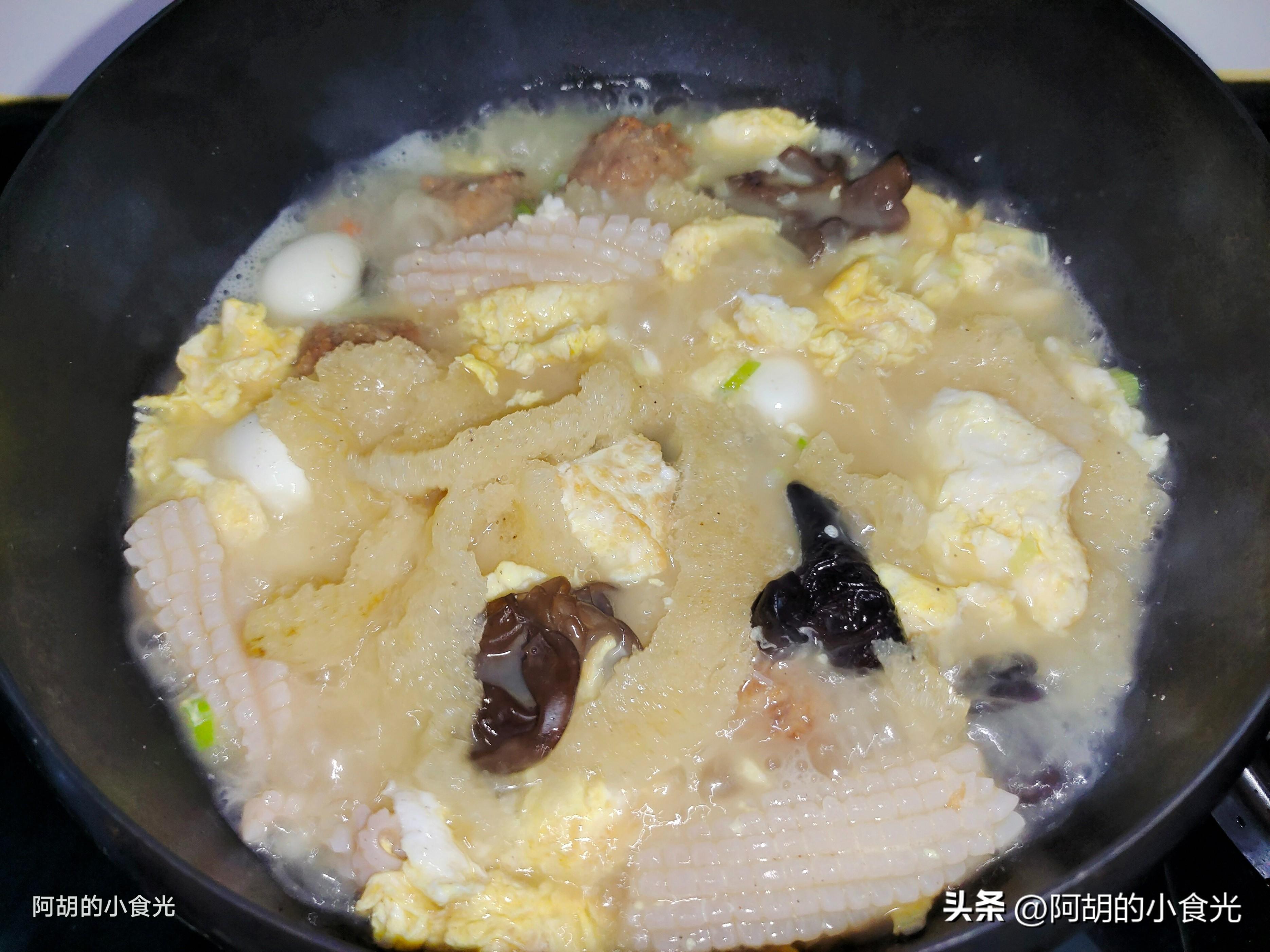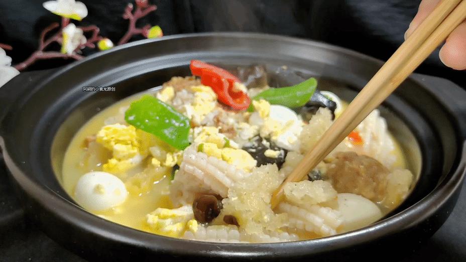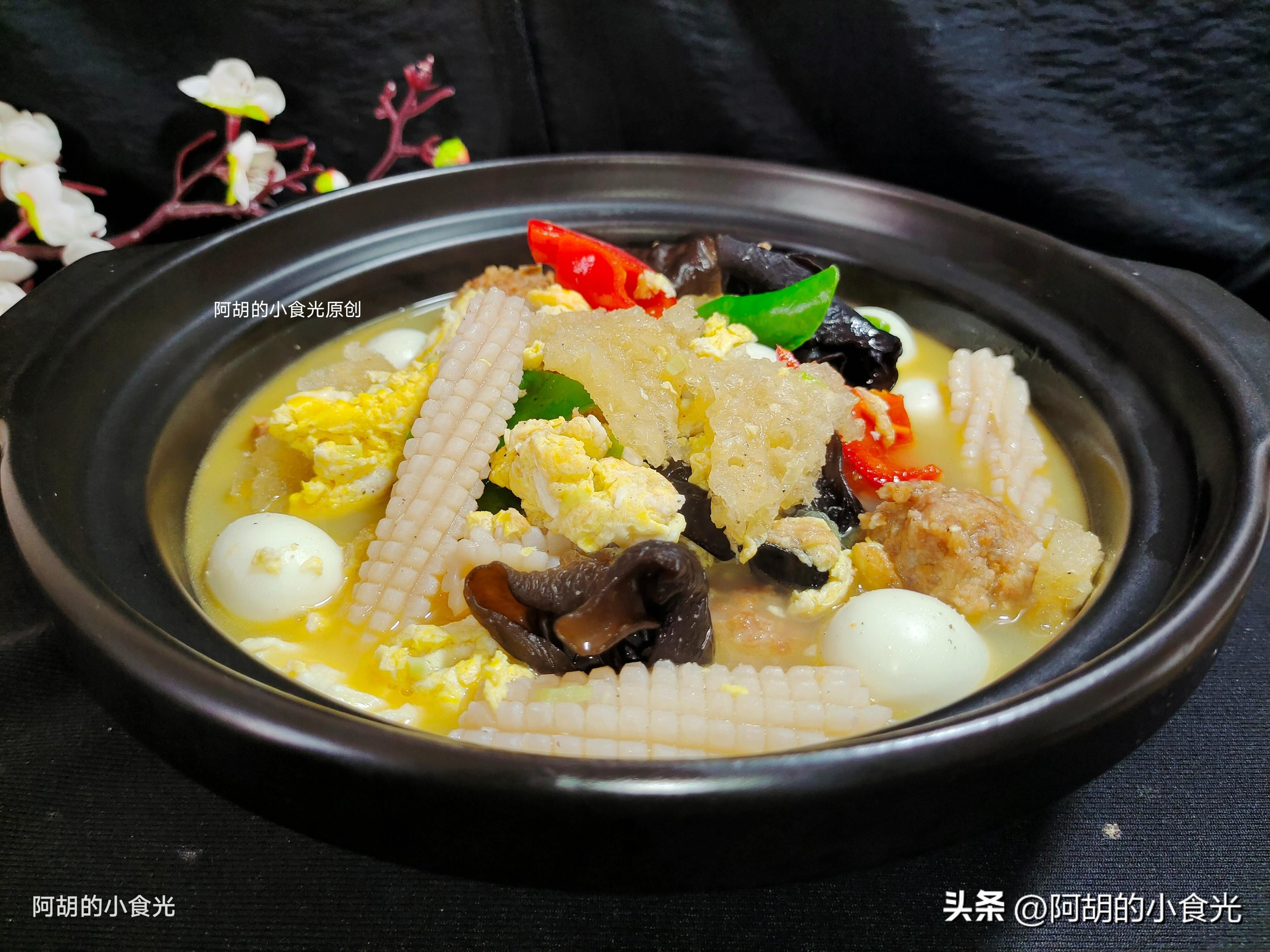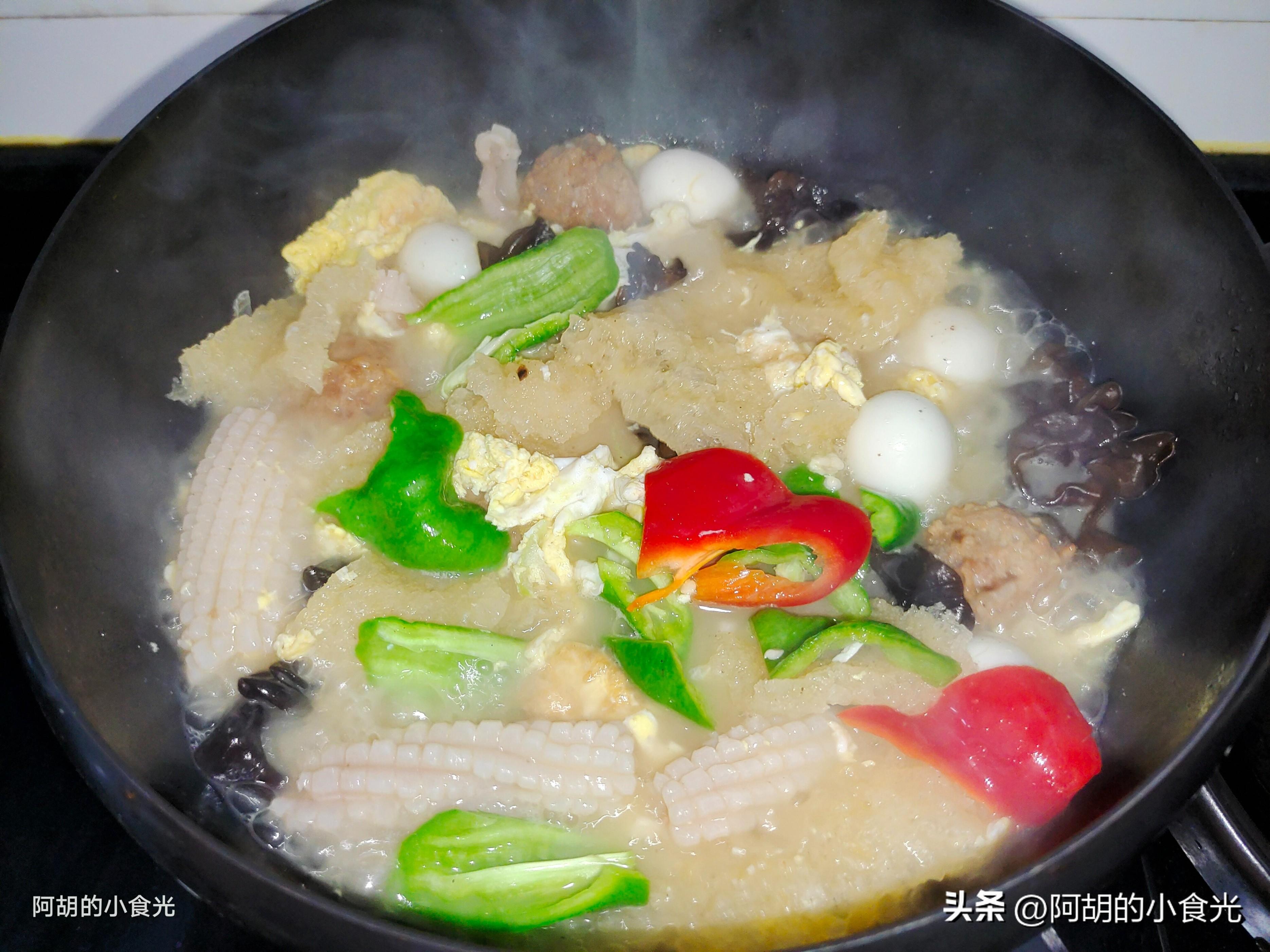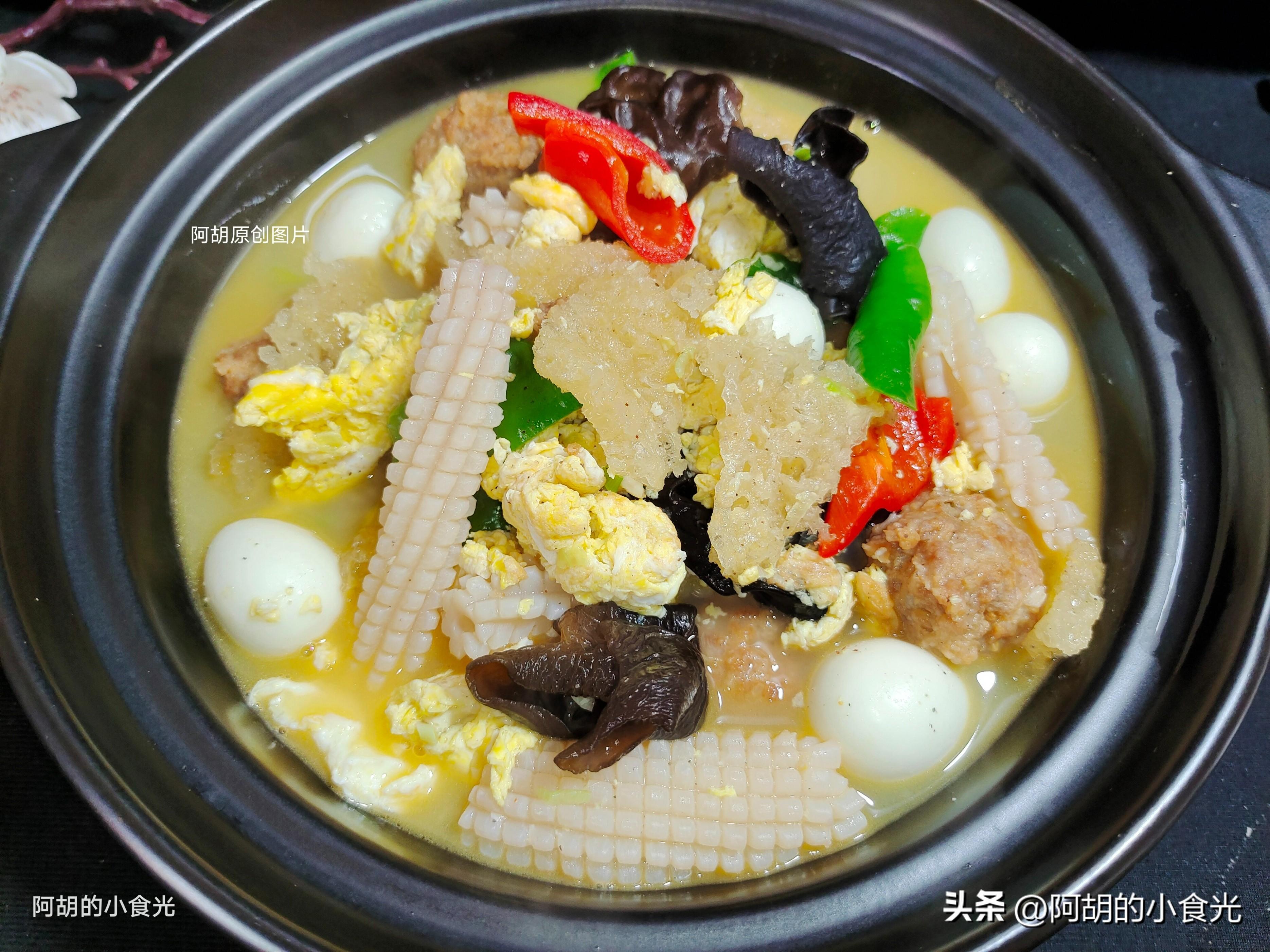 鵪鶉蛋、炸肉丸、魷魚、皮肚、木耳、青紅椒和雞蛋就是今天這道菜的組成部分,其實就是老家的“大雜燴”,這菜主打的是鮮爽開胃,菜嫩湯鮮,天冷時來一鍋,熱乎乎的特舒爽。