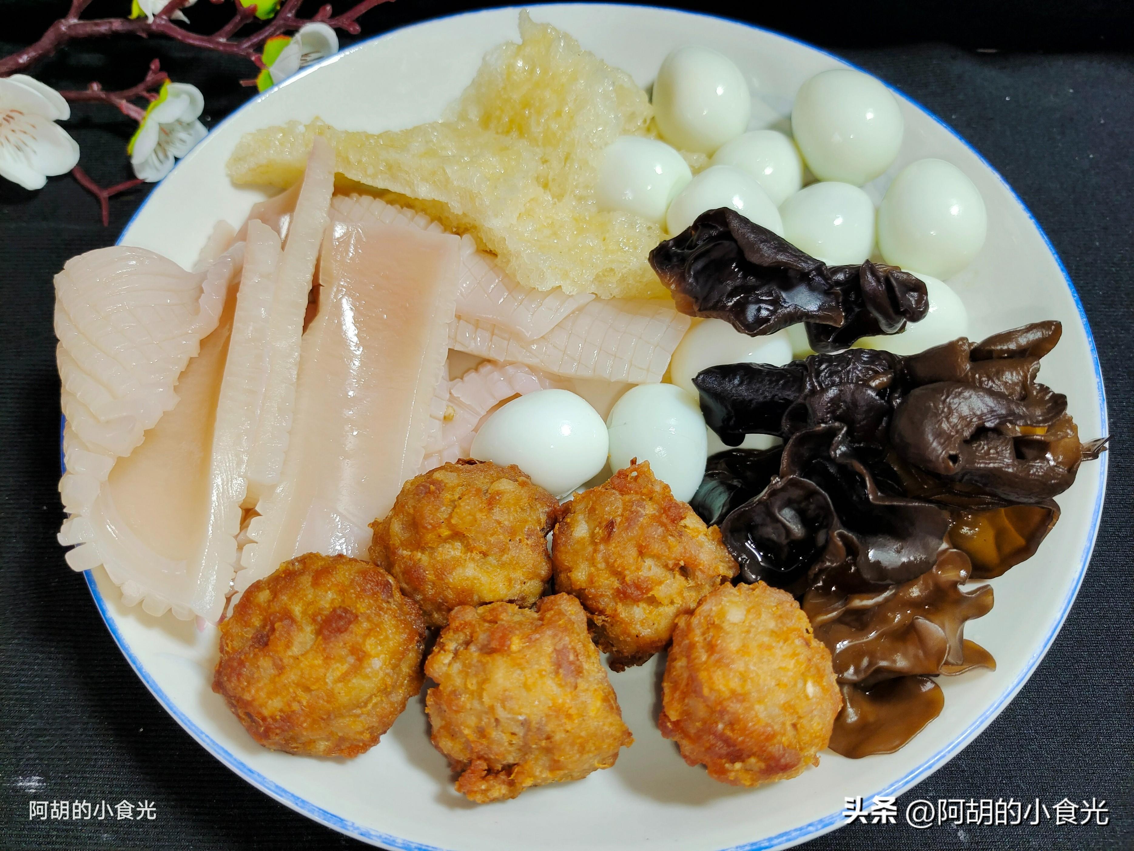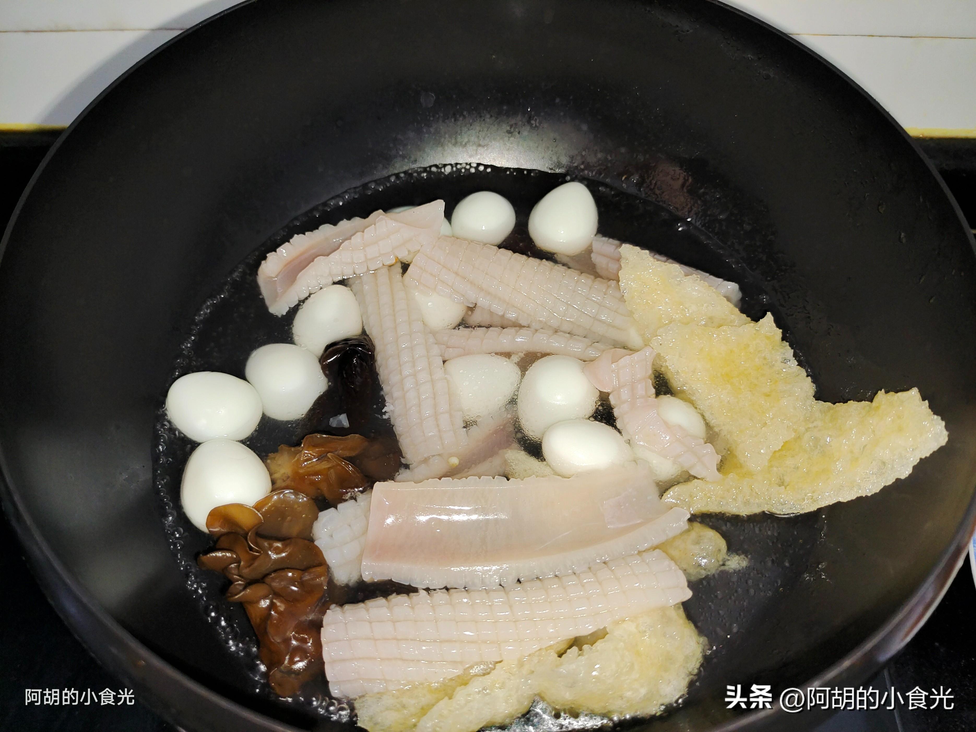 第一步:用的食材比較多,前面就先來準備和處理這些食材。有煮熟的鵪鶉蛋十個左右去殼待用,泡發的少許木耳,泡軟的皮肚適量,切好的鮮魷魚花適量,油炸的豬肉丸子五六個左右。這其中皮肚一定要用油發的,泡軟後比較鬆軟,可以吸收湯汁。油炸的豬肉丸子也可以用牛肉丸或者水汆的丸子代替。