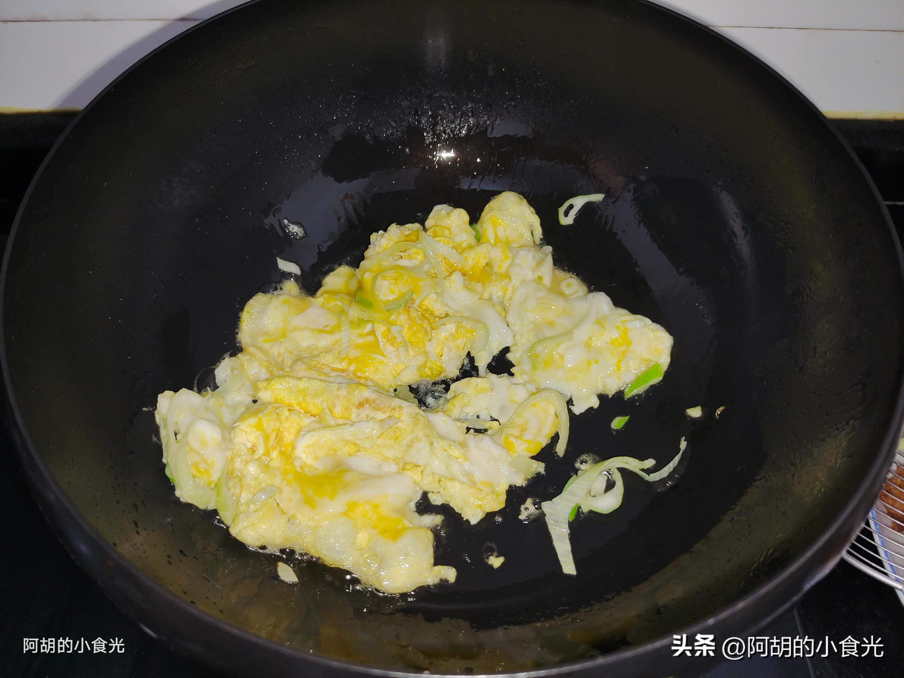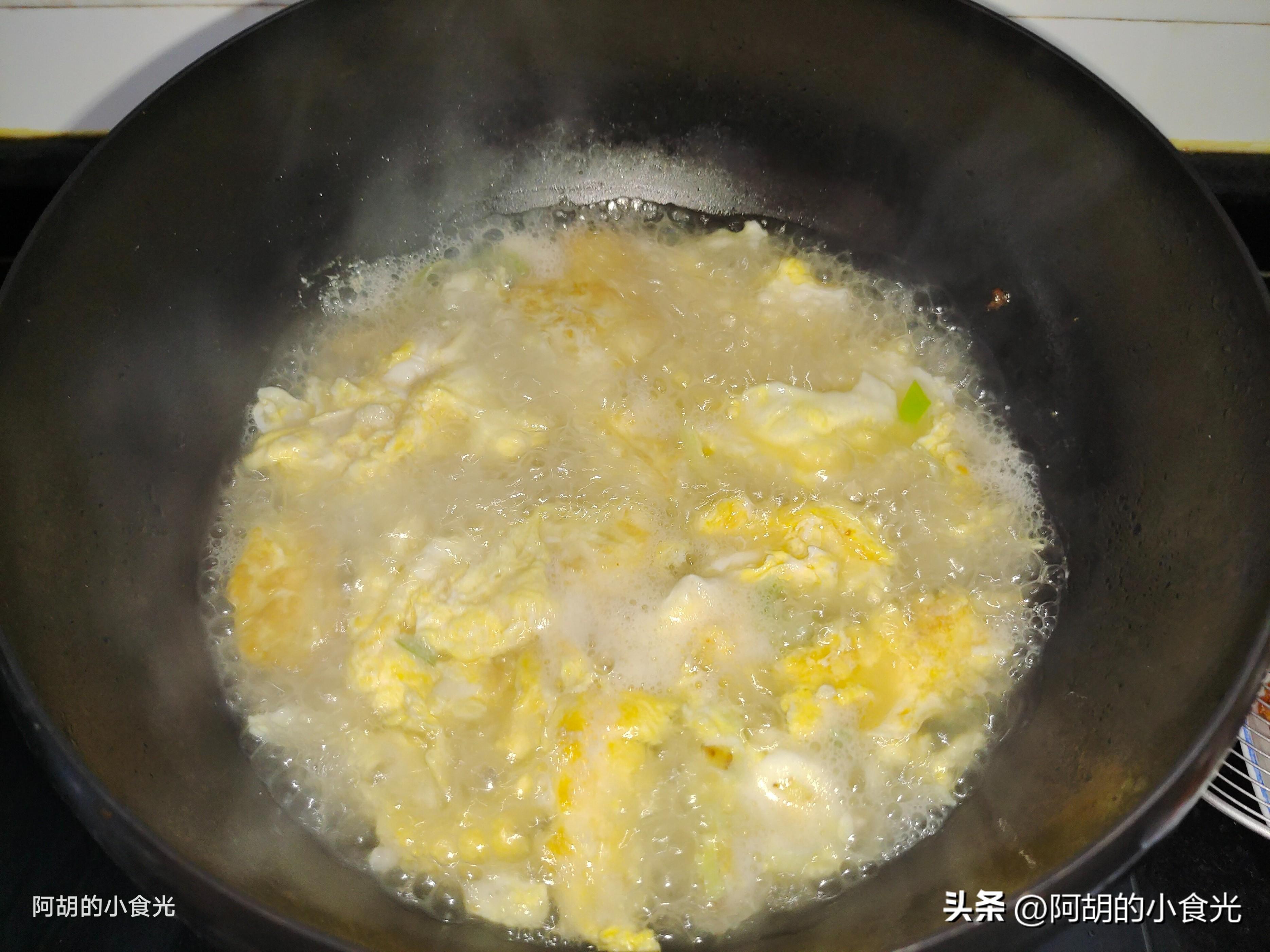 第四步:做這道菜一定要有高湯,但並不是所有家庭都備着這個高湯,今天就用一個簡易的方法來兌這個高湯。把鍋烘乾後淋入一些花生油燒熱,而後準備兩個雞蛋攪勻後淋入鍋中,就這樣炒一炒,把雞蛋炒凝固炒出香味,再撒入一些蔥薑蒜末炒一炒,此時一定要用開水衝入鍋中,轉爲最大火煮一煮,再撒入一些雞精增鮮,把湯汁煮至泛白即可。
