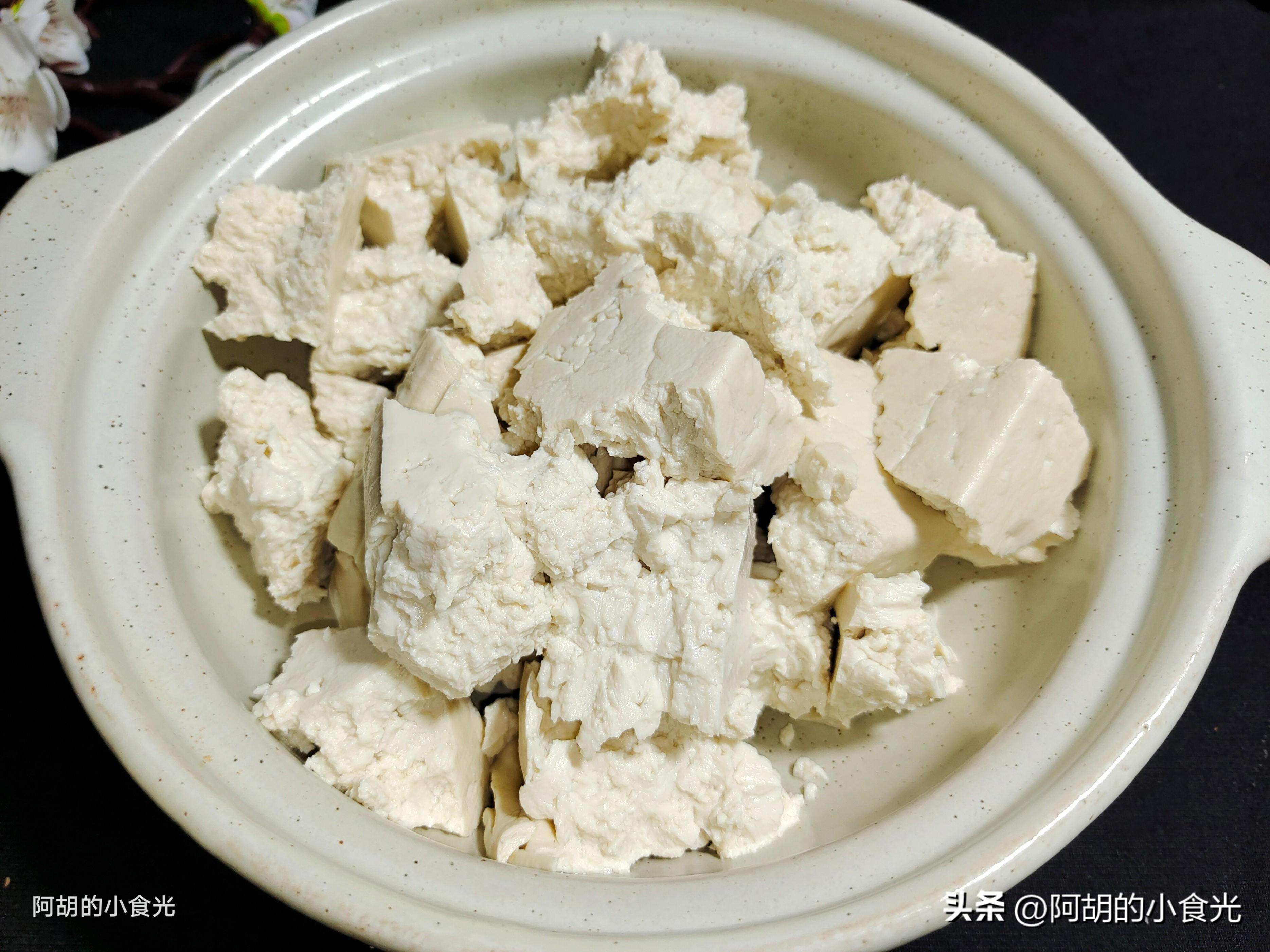 第一步:先來準備老豆腐,今天用的豆腐是鹽滷豆腐,口感和味道都恰到好處,不用刀切直接用手掰開成大塊放入碗中備用,掰開凹凸不平的表面可以掛住更多的湯汁,方便其入味。