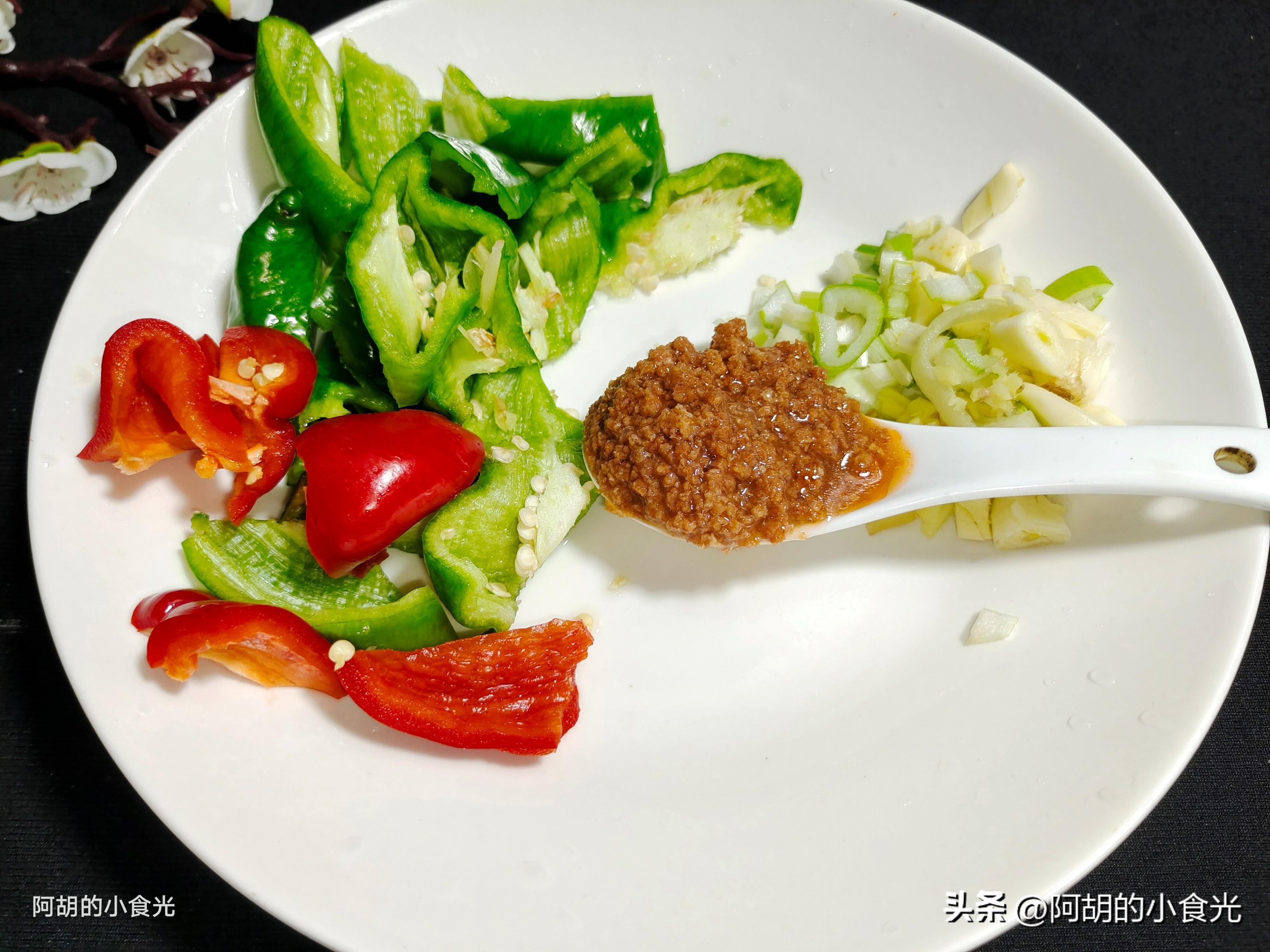 第二步:所需的配菜很簡單,最重要的就是“蝦醬”這個調料,準備個3湯匙左右就可以了。想要嘗試蝦醬的可以網購試一試。再有青紅椒各一個用來搭配顏色和提提味,還有一些蔥薑蒜末作爲小料使用,喜歡辣味的可以適當添加幾個幹辣椒節。