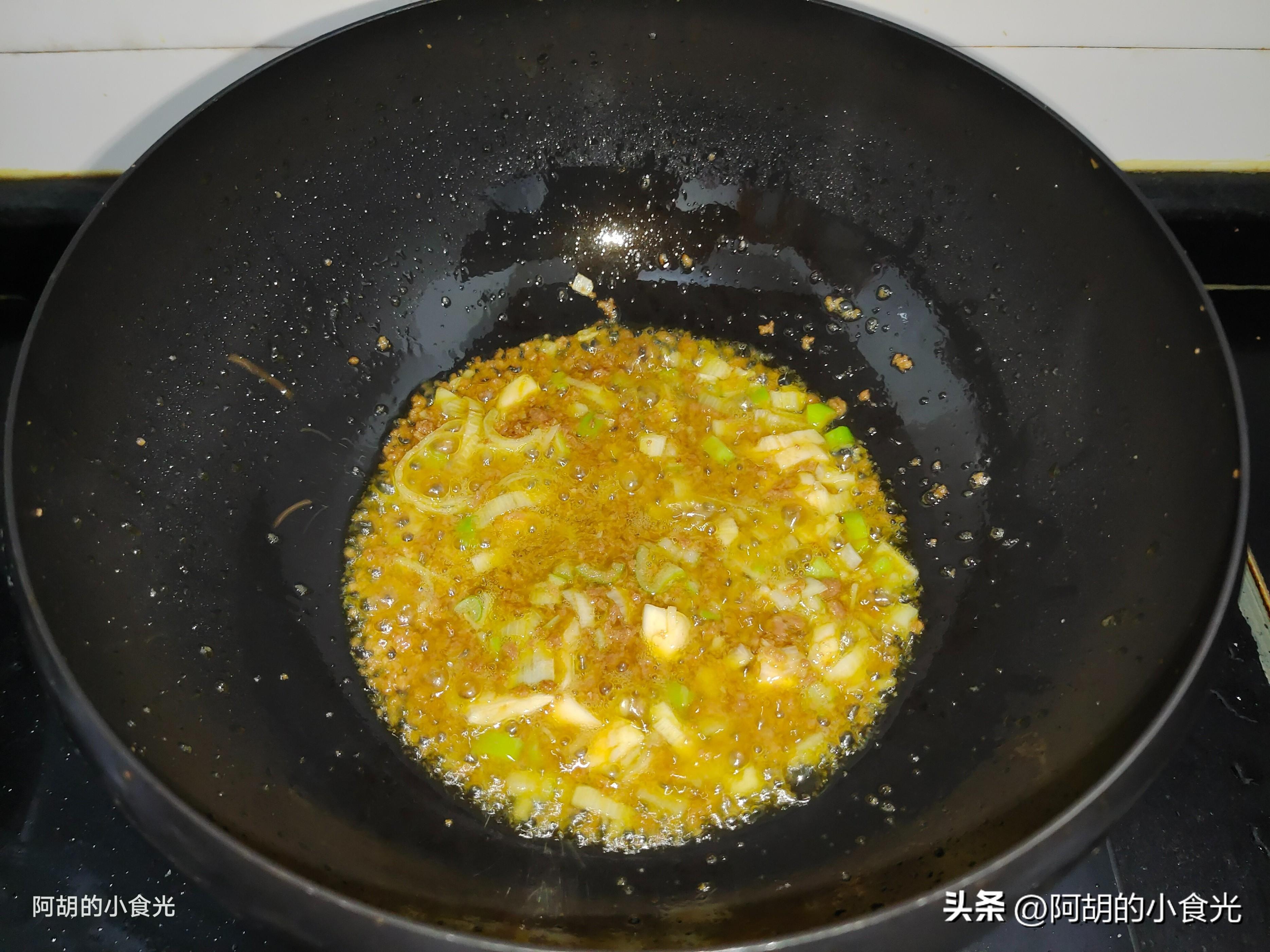 第三步:食材都很簡單,重要的是烹飪這一步,先大火把鍋烘乾,淋入一些菜籽油轉爲小火燒熱,而後直接把蝦醬倒入鍋中,小火炒出香味,再把蔥薑蒜末一塊倒入鍋中炒出香味。