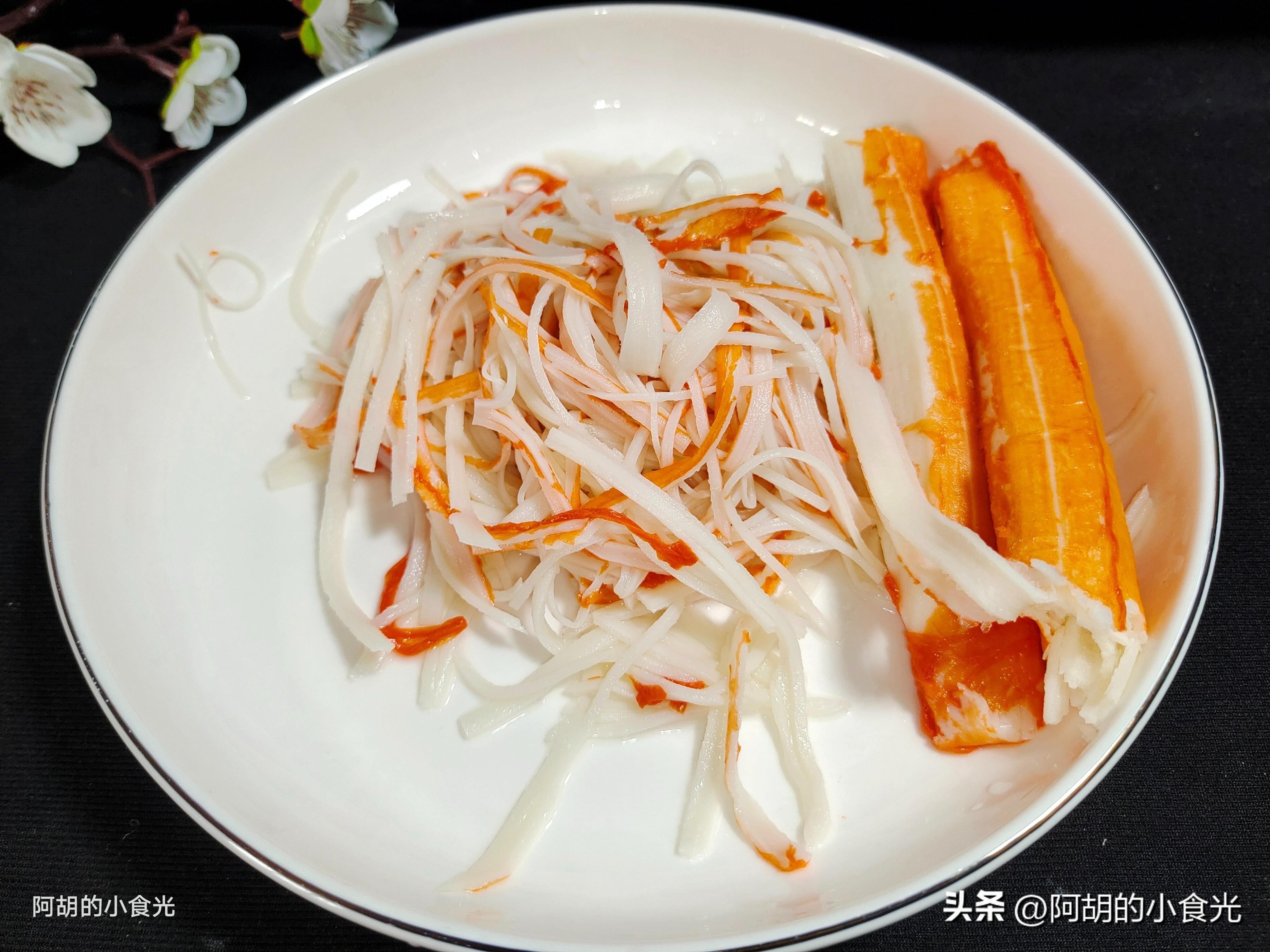 第一步:先來準備蟹柳棒,這個蟹柳並不是純蟹肉製作的,而是用魚肉製作的“蟹味”食材,喫起來味道也很不錯的,我用的比較長一些,兩根就夠了。置於室溫中解凍後用手捏一捏,將其捏散開來,而後再撕開成蟹柳絲放入碗中備用。