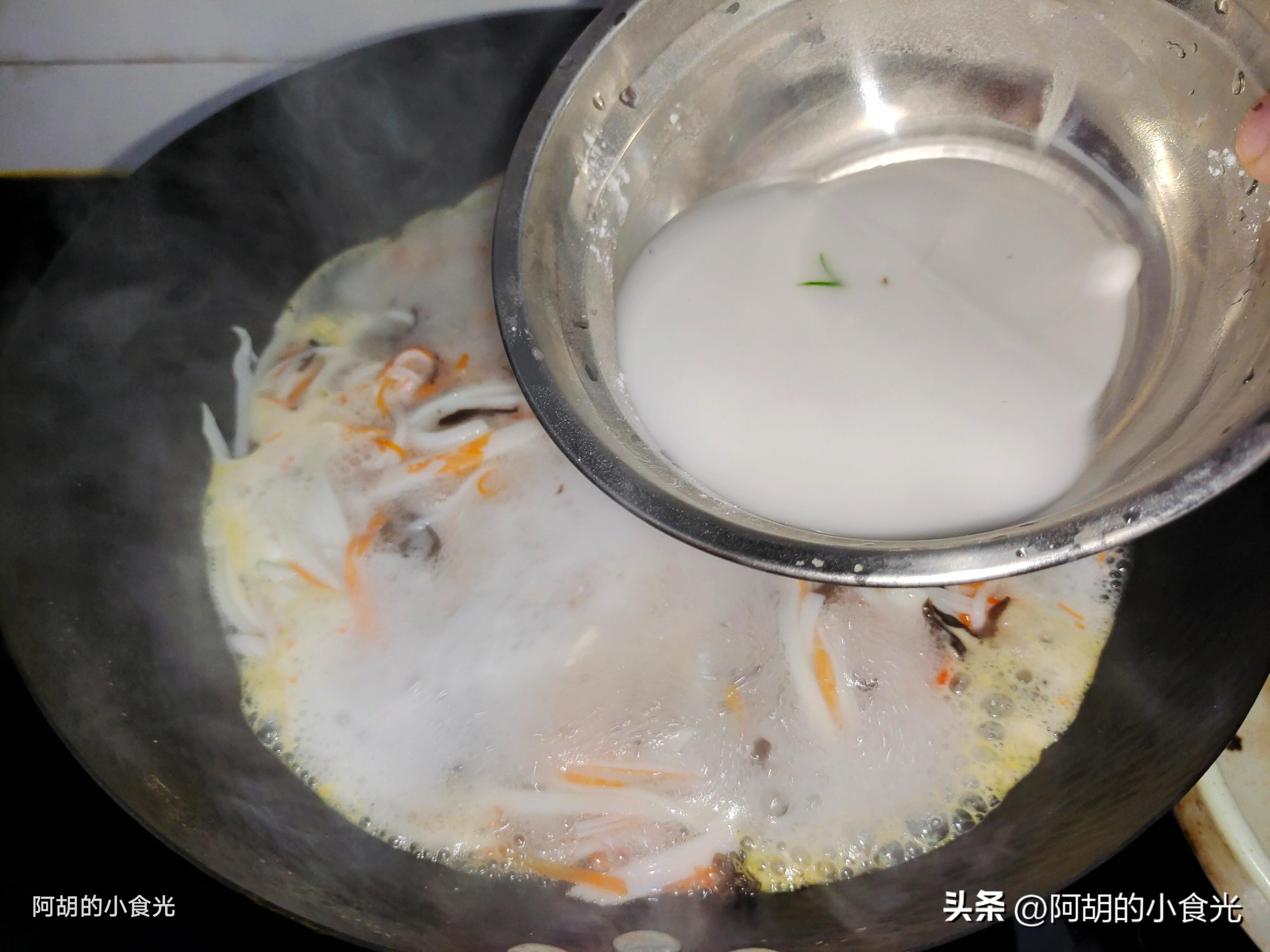 第四步:煮個差不多5分鐘左右就開始調味,加入一些食鹽、雞精和白胡椒粉即可。而後用涼水稀釋一些生粉成澱粉水,直接慢慢淋入鍋中,同時鍋內要保持大火沸騰,用勺子攪拌開來,讓澱粉水入鍋後迅速均勻地糊化開來,最後讓湯汁略微有一些稠度即可。