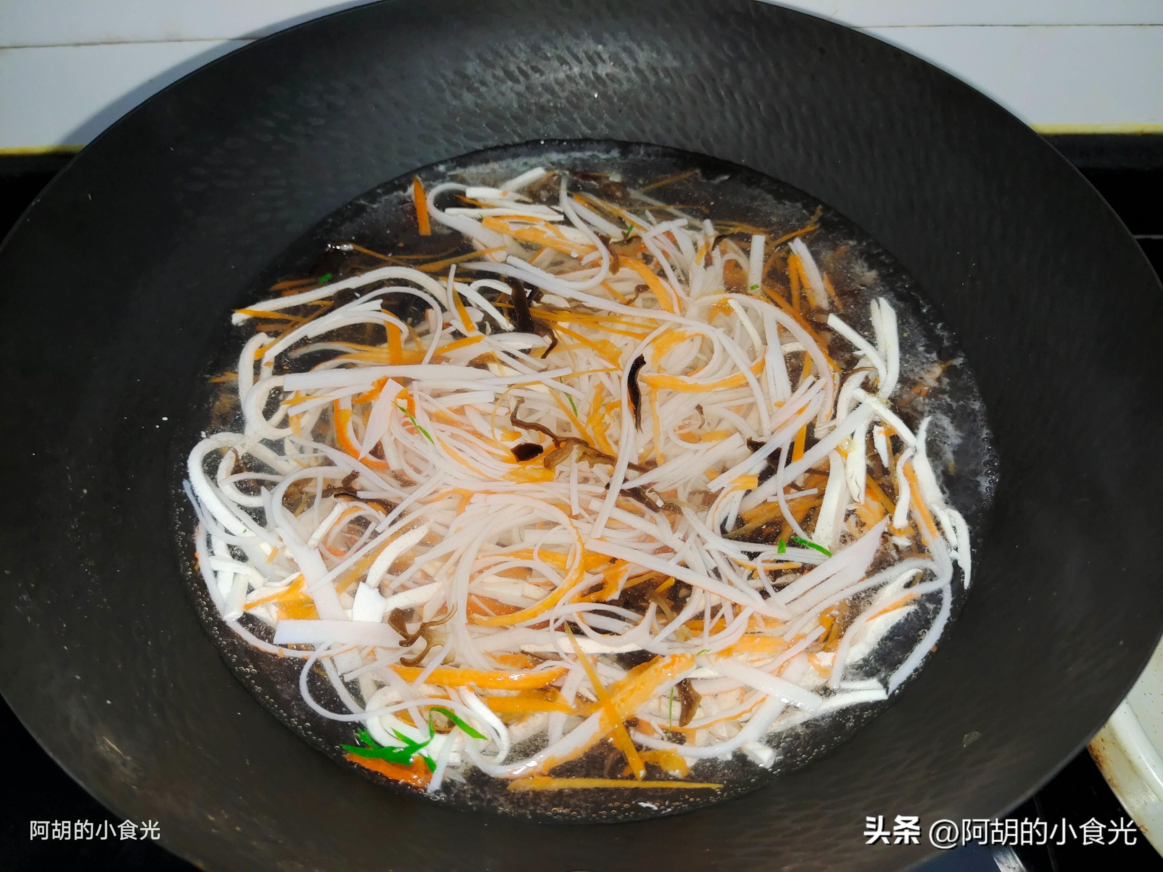 第三步:時間就是這麼簡單幾種,全部備好後就可以開火燒湯了。直接往鍋中添入適量的涼水,開大火將其煮開煮沸,而後把蟹柳絲、木耳絲、嫩豆腐絲、胡蘿蔔絲一塊倒入鍋中開始煮。